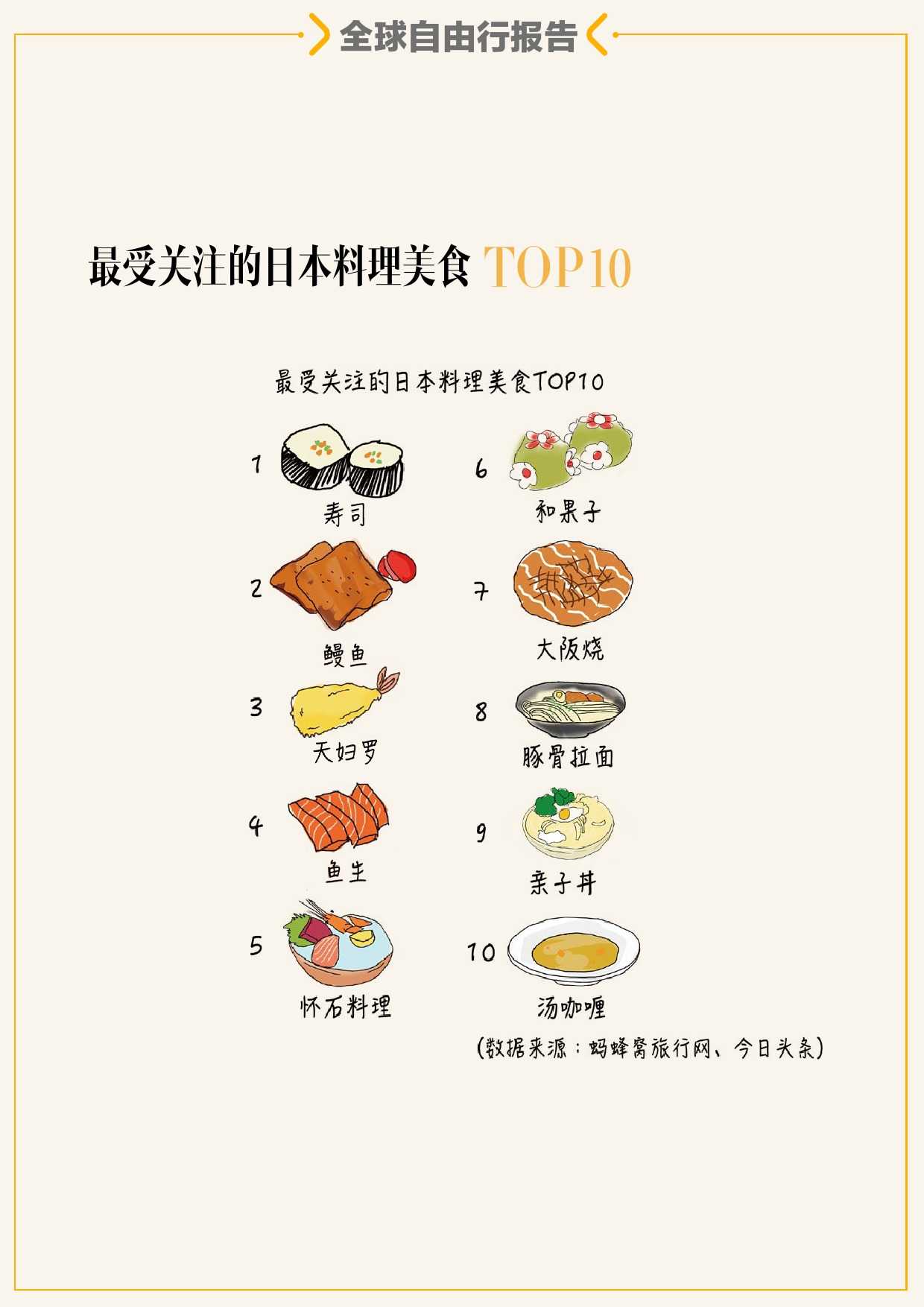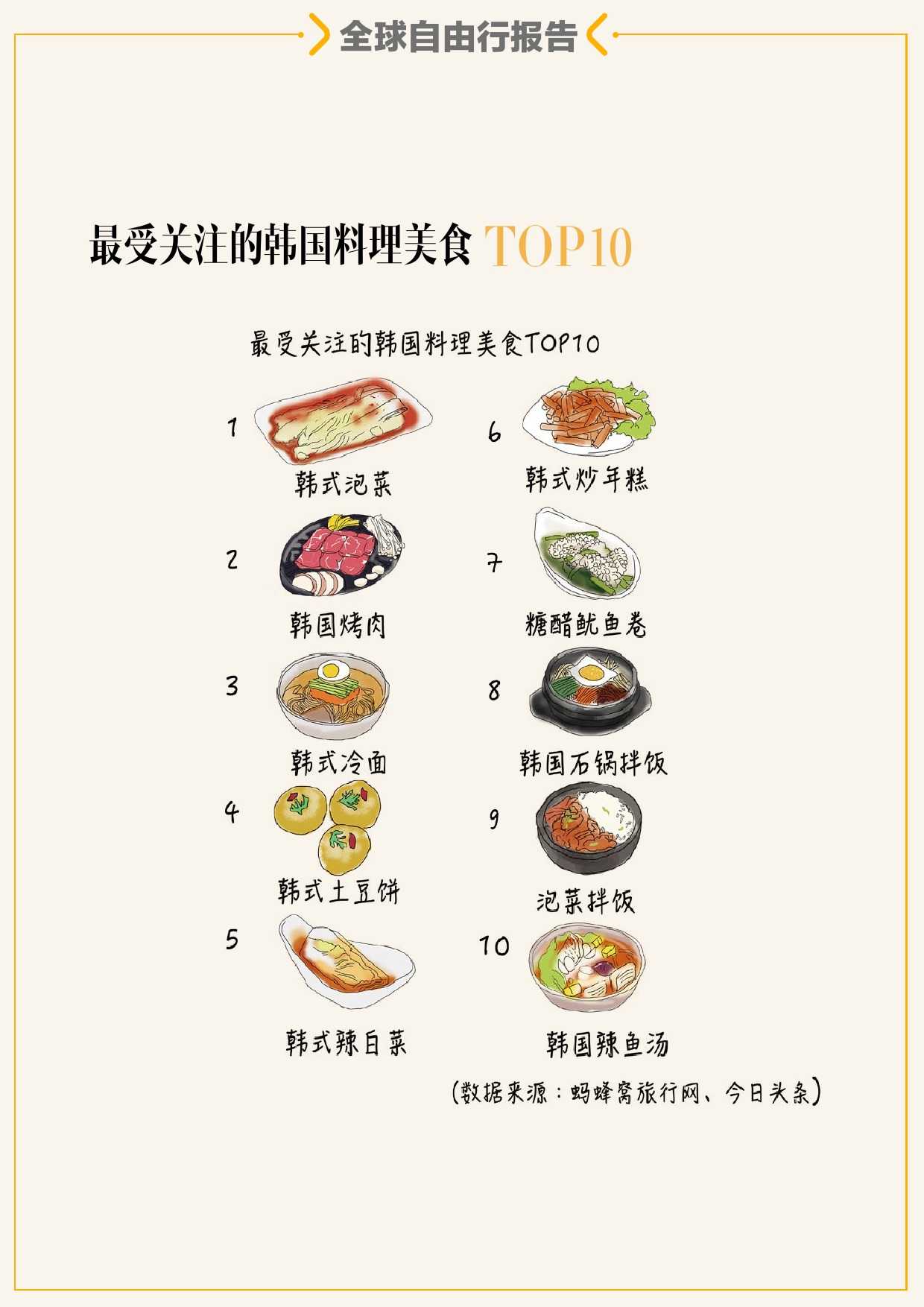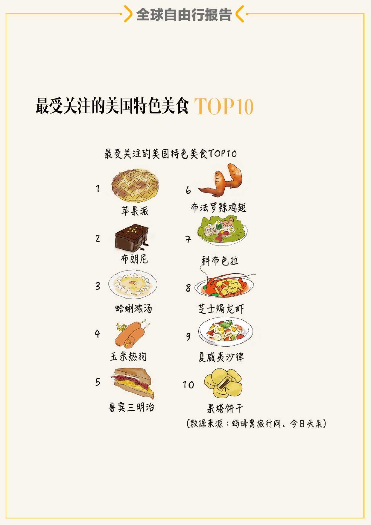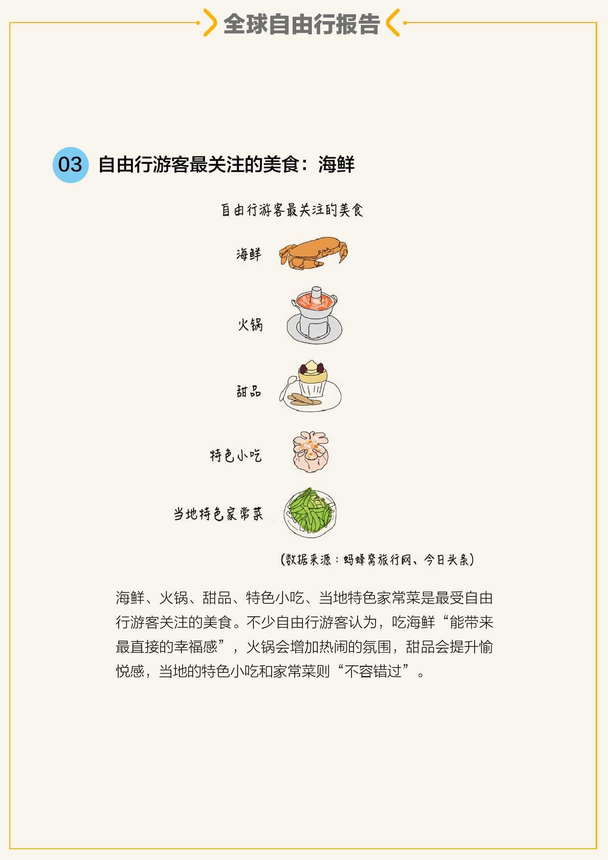 海鲜、火锅、甜品、特色小吃、当地特色家常菜是最受自由行游客关注的美食。不少自由行游客认为,吃海鲜“能带来最直接的幸福感”,火锅会增加热闹的氛围,甜品会提升愉悦感,当地的特色小吃和家常菜则“不容错过”。