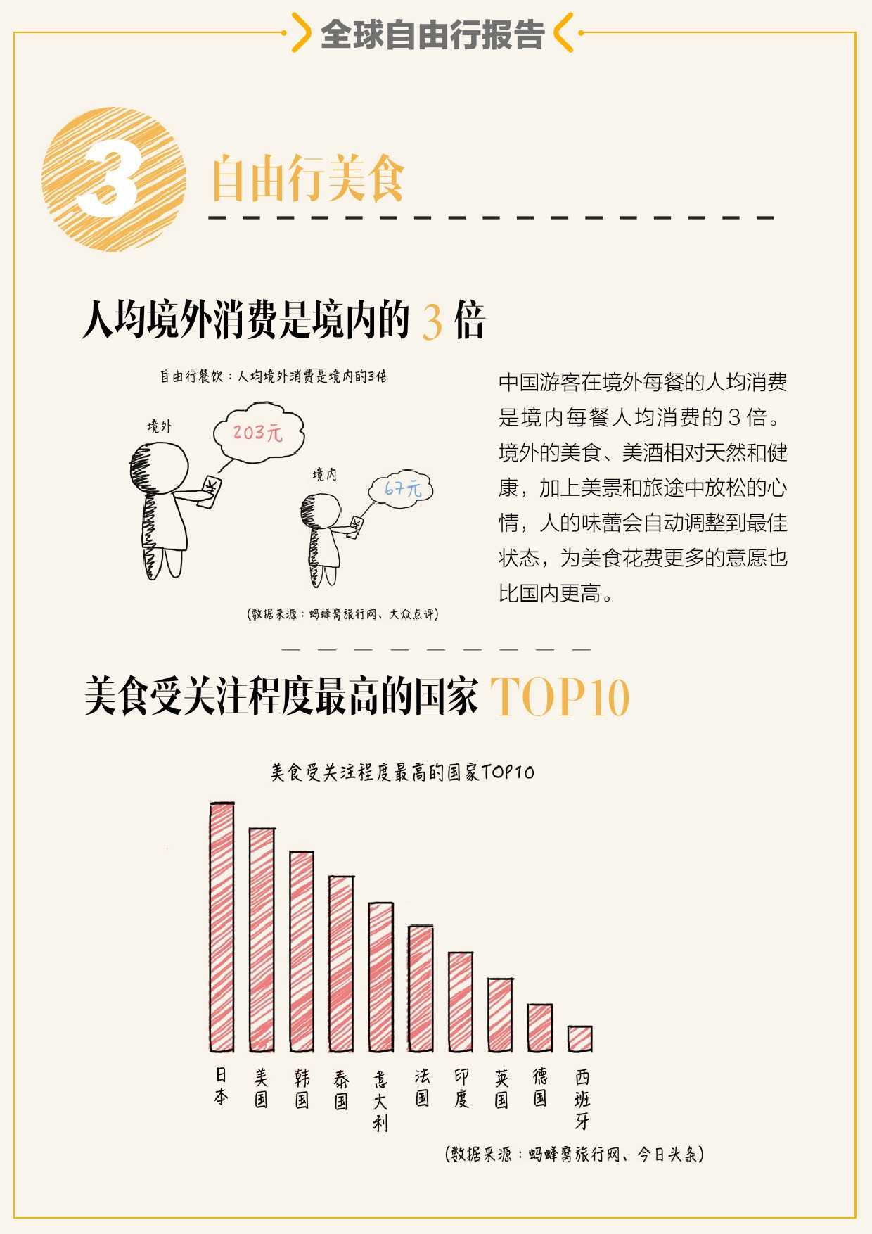 中国游客在境外自由行时平均每餐人均消费金额203元;境内自由行时平均每餐人均消费金额67元。报告分析认为,这主要由两个因素造成:其一,旅游消费升级、中产收入阶层扩大,自由行游客愿意花更多的钱去购物与品尝美食;其二,在线旅游快速发展,机票、酒店等标准类旅游产品的整体价格因竞争被不断拉低。