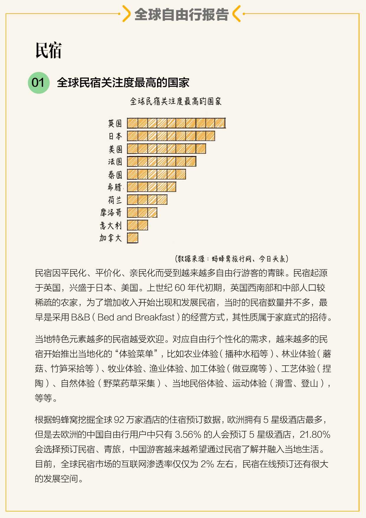 全球民宿关注度最高的10大国家分别是英国、日本、美国、法国、泰国、希腊、荷兰、摩洛哥、意大利、加拿大。目前,全球民宿市场的互联网渗透率仅为 2%左右,民宿在线预订还有很大的发展空间。