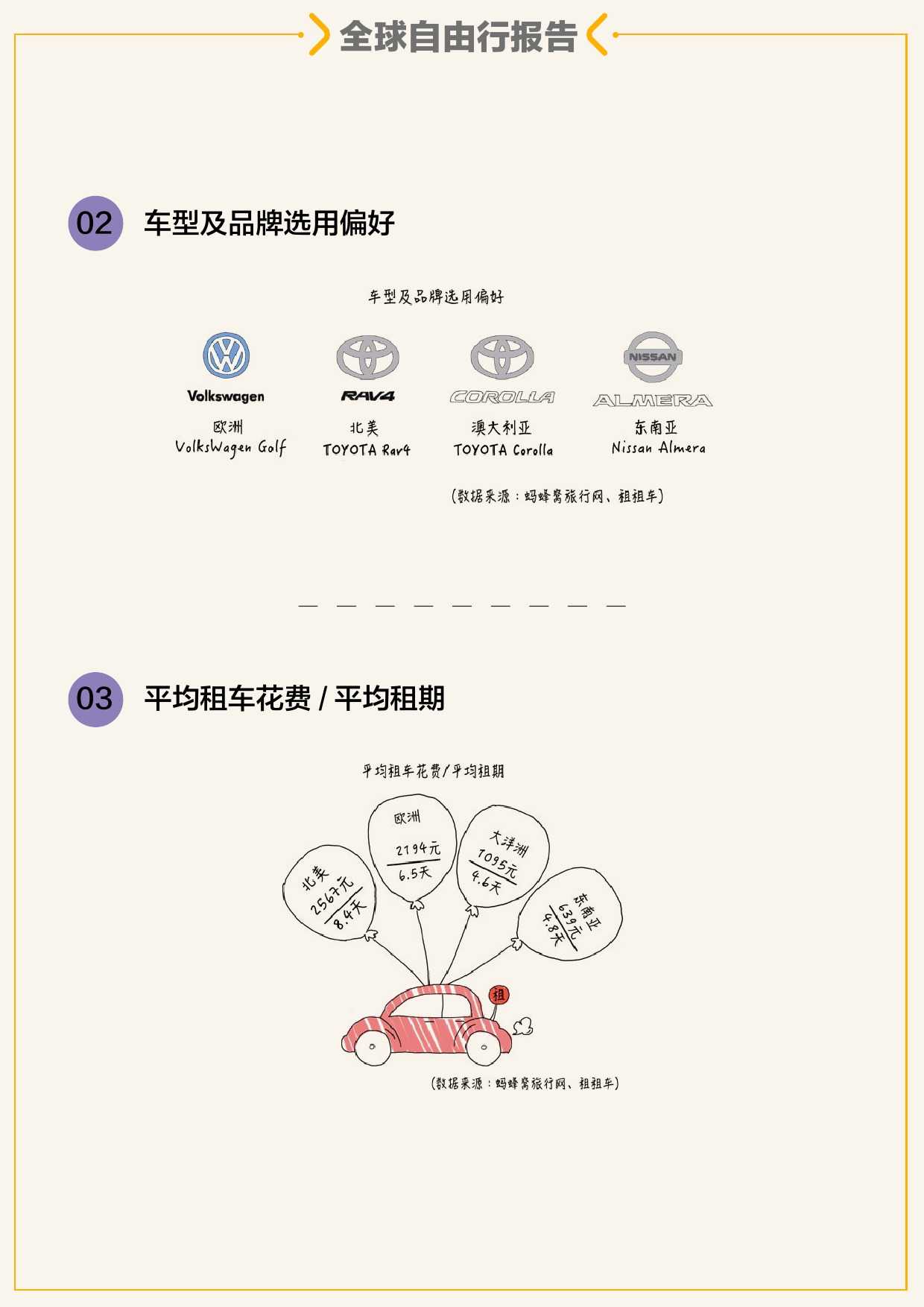 从全球租车的平均花费/平均租期来看,北美停留的时间最长、费用最多(2567元/8.4天),欧洲性价比最高(2194元/6.5天),大洋洲(1095元/4.6天)、东南亚最便宜(639元/4.8天)。