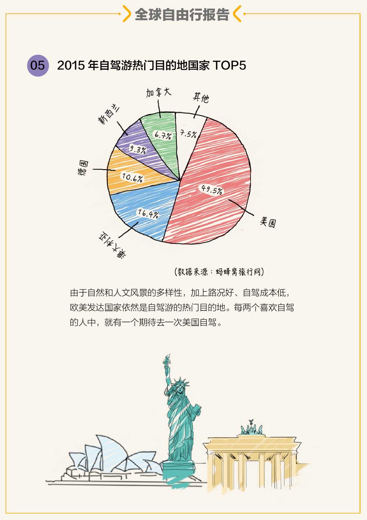 美国(49.5%)、澳大利亚(16.4%)、德国(10.6%)、新西兰(9.3%)、加拿大(6.7%)分别是2015年最热门的自驾游目的地。每两个喜欢自驾的中国旅行者中,就有一人期待去美国自驾一次。由于自然和人文风景的多样性,加上路况好、自驾成本低,欧美发达国家依然是自驾游的热门目的地。