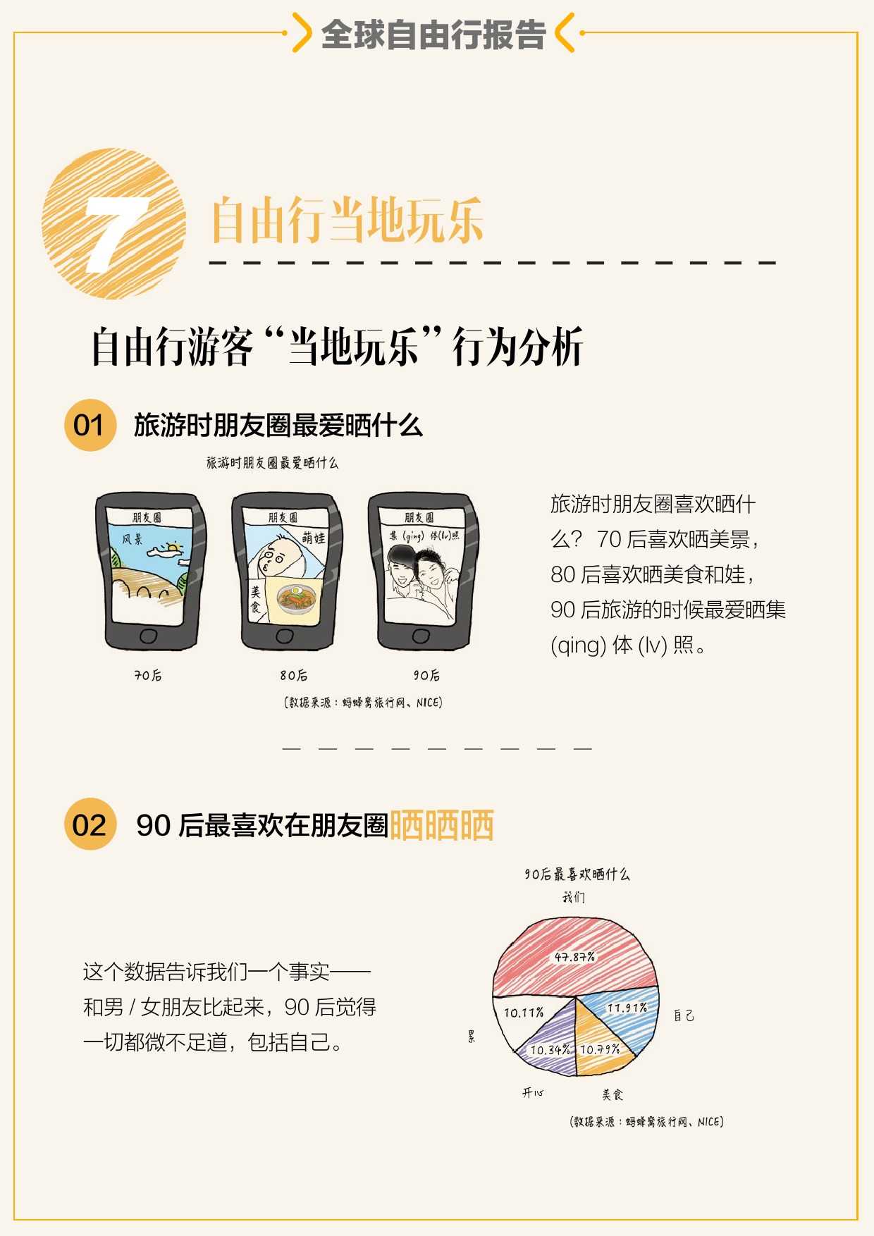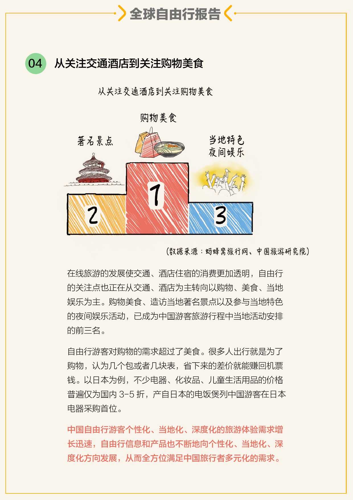 在线旅游的发展使交通、酒店住宿的消费更加透明,自由行的关注点也正在从交通、酒店为主转向以购物、美食、当地娱乐为主。购物美食、造访当地著名景点以及参与当地特色的夜间娱乐活动,已成为中国自由行游客旅游行程中当地活动安排的前三名。