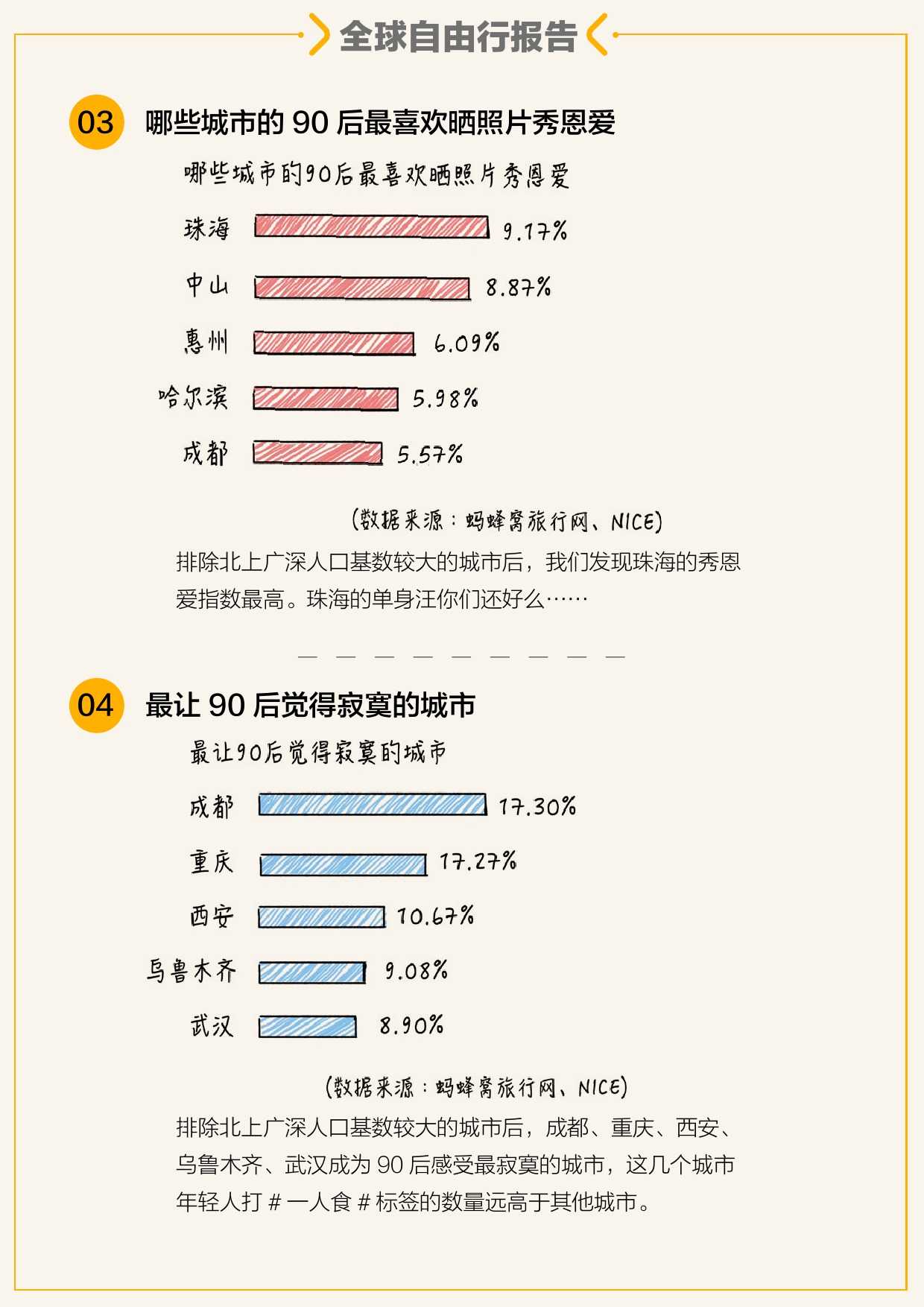 在“最让90后觉得寂寞的城市”中,排除北上广深人口基数较大的城市后,成都(17.30%)、重庆(17.27%)、西安(10.67%)、乌鲁木齐(9.08%)、武汉(8.90%)成为90后感受最寂寞的城市,这几个城市年轻人打#一人食#标签的数量远高于其他城市。夜生活越丰富的城市,越容易让年轻的90后感到寂寞。