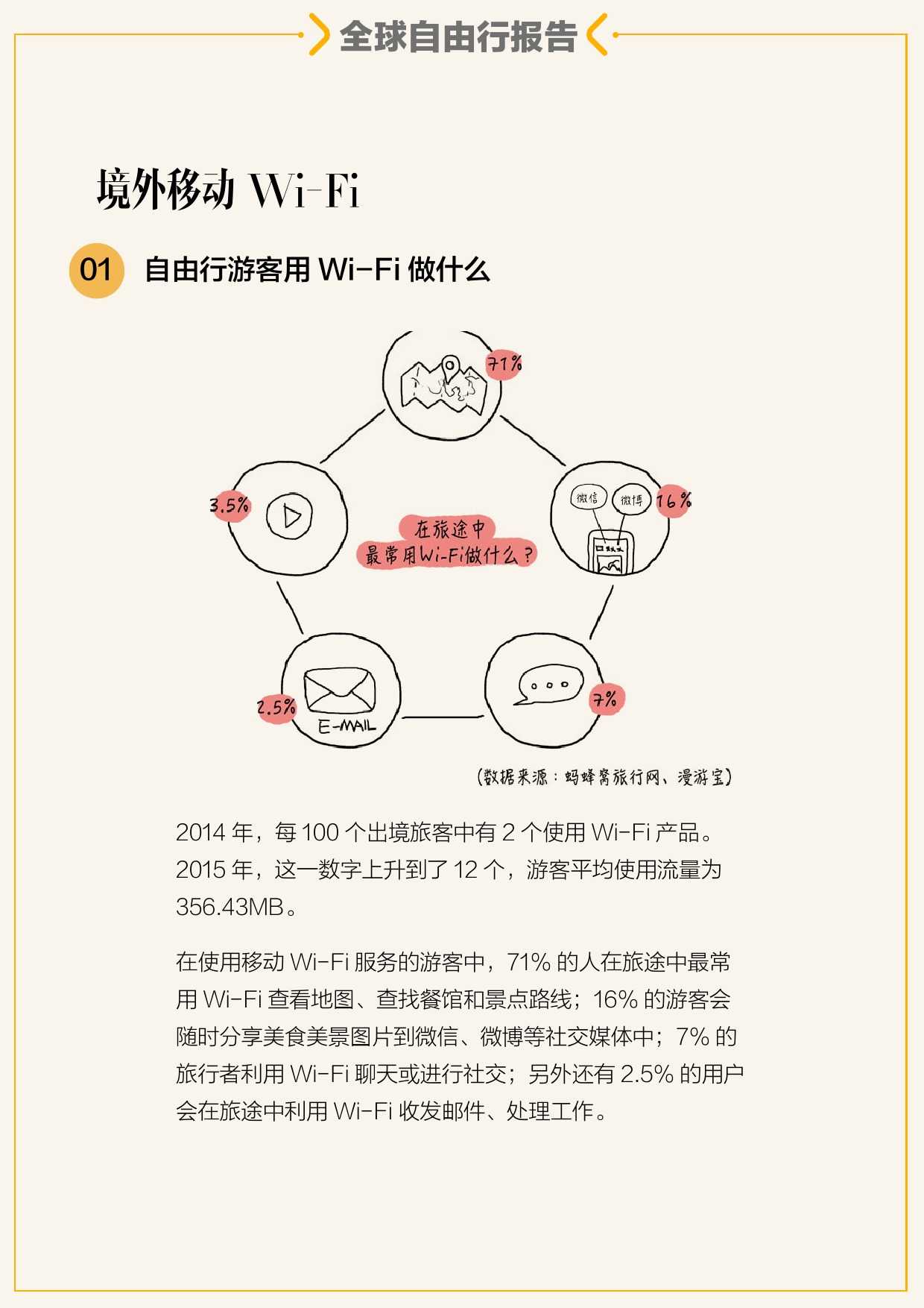 在使用移动Wi-Fi服务的游客中,71%的人在旅途中最常用Wi-Fi查看地图、查找餐馆和景点路线;16%的游客会随时分享美食美景图片到微信、微博等社交媒体中;7%的旅行者利用Wi-Fi聊天或进行社交;另外还有2.5%的用户会在旅途中利用Wi-Fi收发邮件、处理工作。