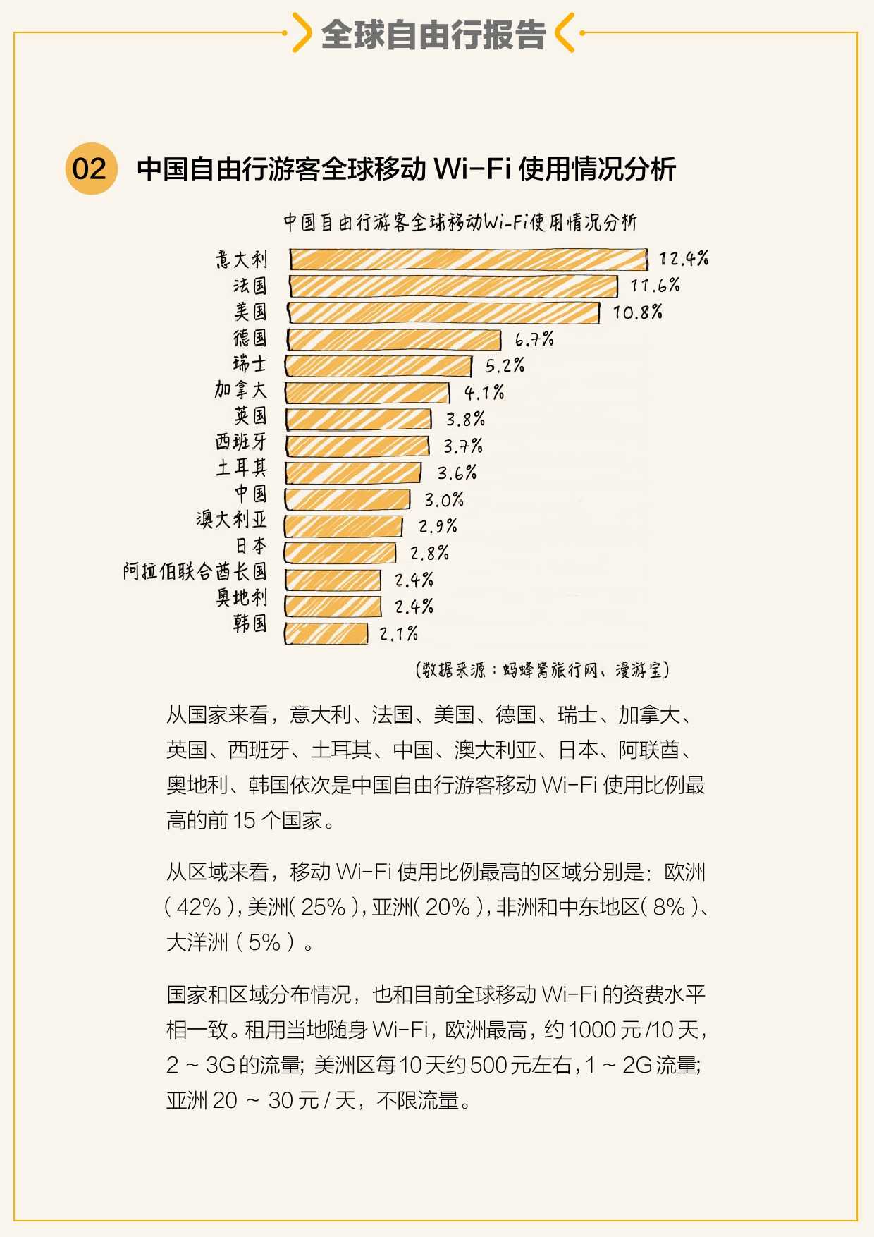 从国家来看,意大利、法国、美国、德国、瑞士、加拿大、英国、西班牙、土耳其、中国、澳大利亚、日本、阿联酋、奥地利、韩国依次是中国自由行游客移动Wi-Fi使用比例最高的前15个国家。