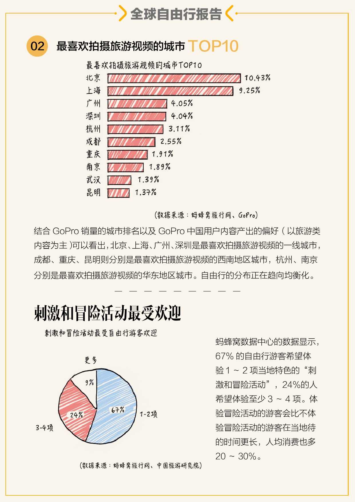 67%的自由行游客希望体验1-2项当地特色的“刺激和冒险活动”,24%的人希望体验至少3-4项。体验冒险活动的游客会比不体验冒险活动的游客在当地待的时间更长,人均消费也多20-30%。