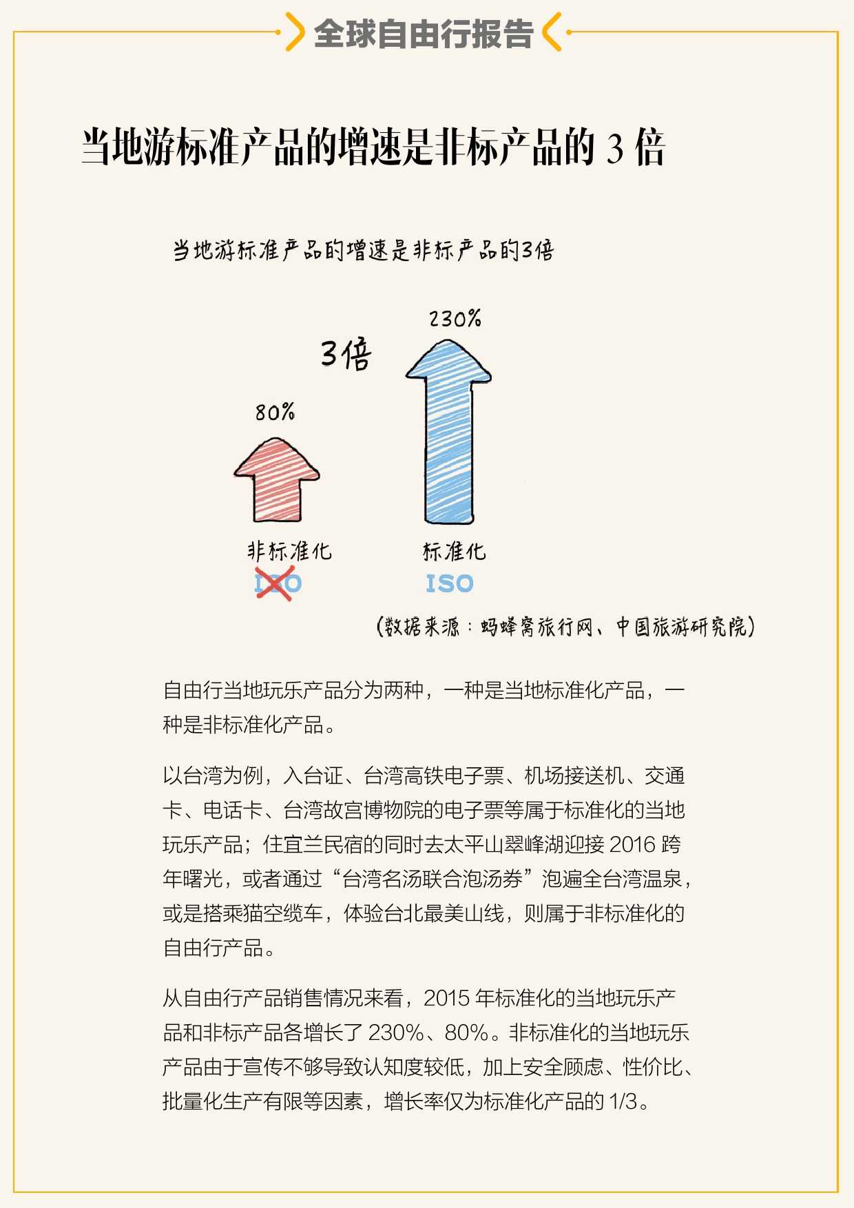 从自由行产品销售情况来看,2015年标准化的当地玩乐产品和非标产品各增长了230%、80%。非标准化的当地玩乐产品由于宣传不够导致认知度较低,加上安全顾虑、性价比、批量化生产有限等因素,增长率仅为标准化产品的1/3。