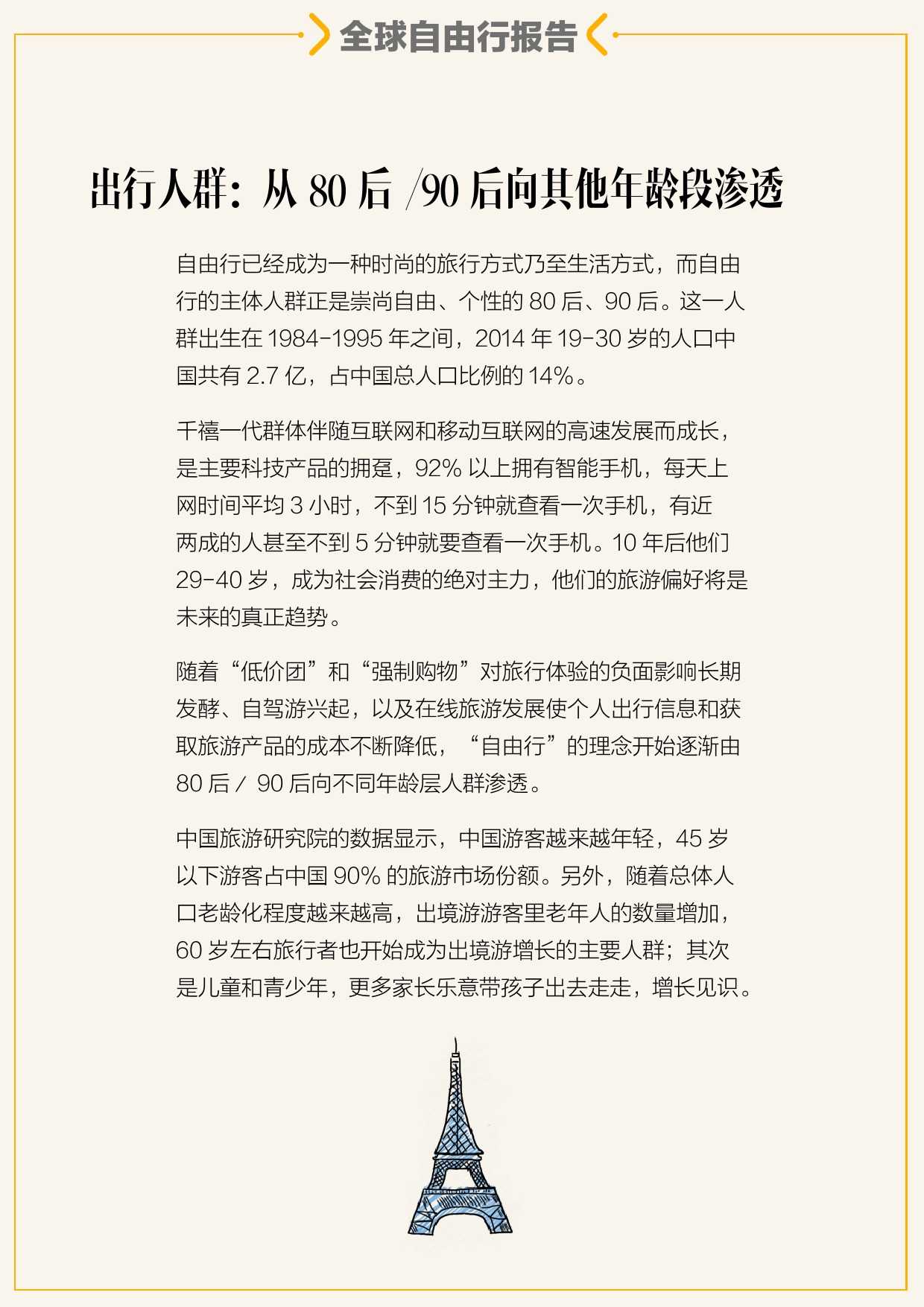 随着“低价团”和“强制购物”对旅行体验的负面影响长期发酵、自驾游兴起,以及在线旅游发展使个人出行信息和获取旅游产品的成本不断降低,“自由行”的理念开始逐渐由80后/90后向不同年龄层人群渗透。