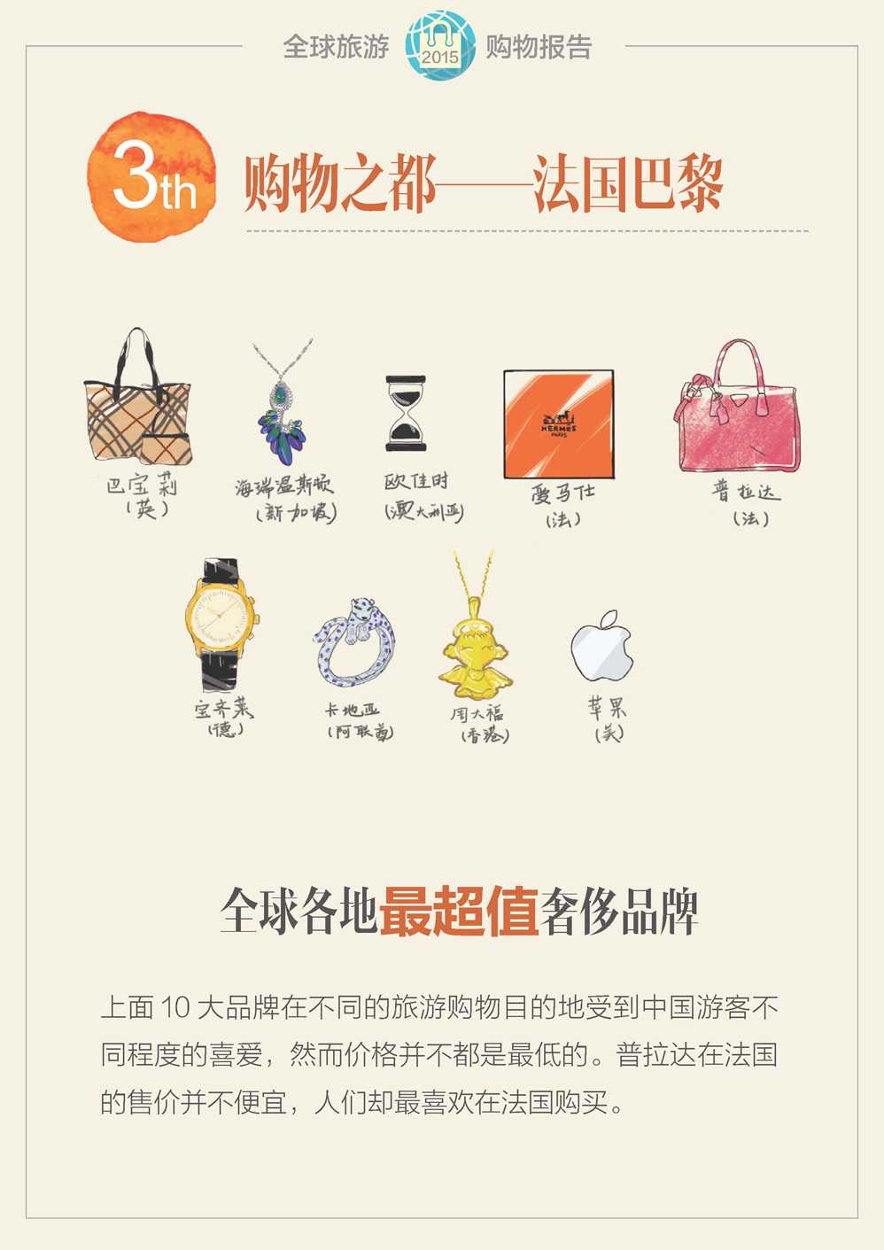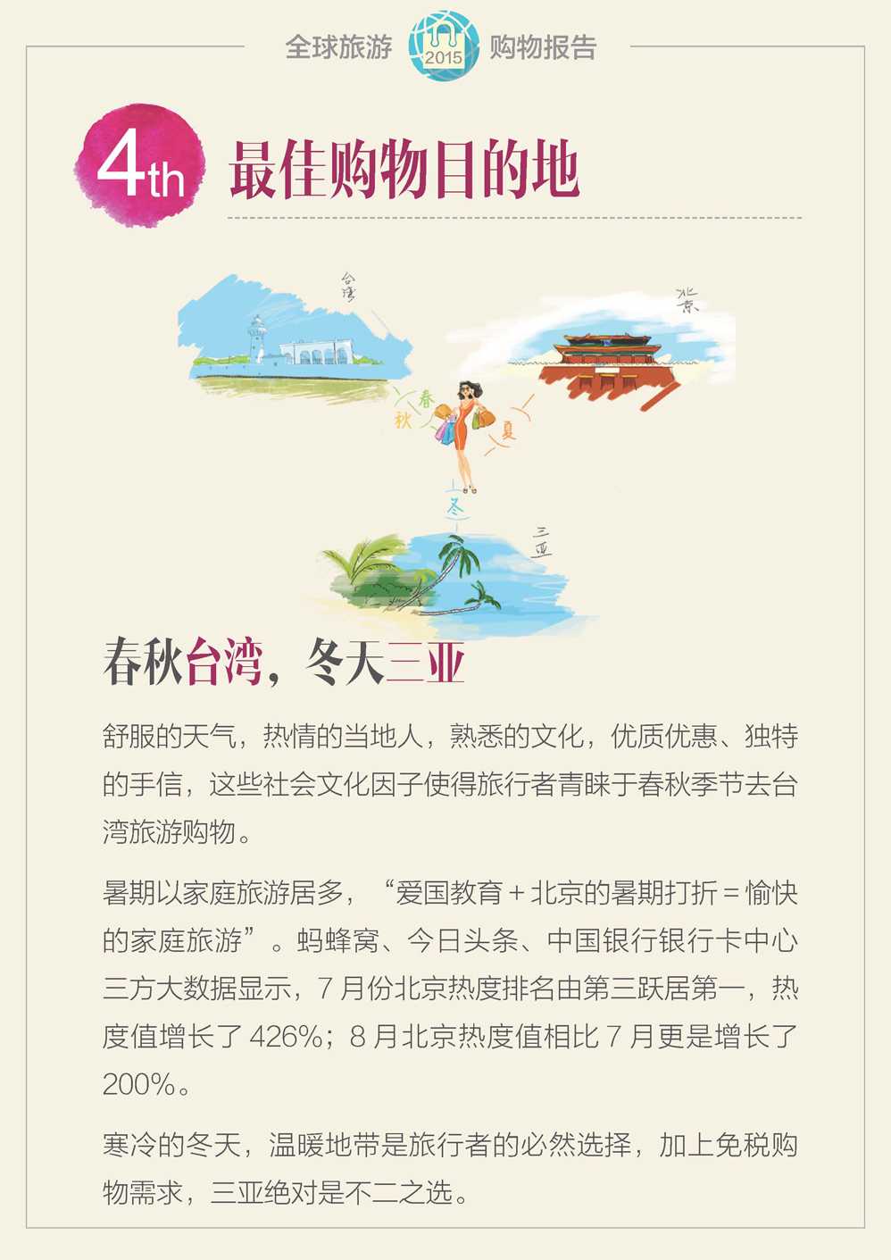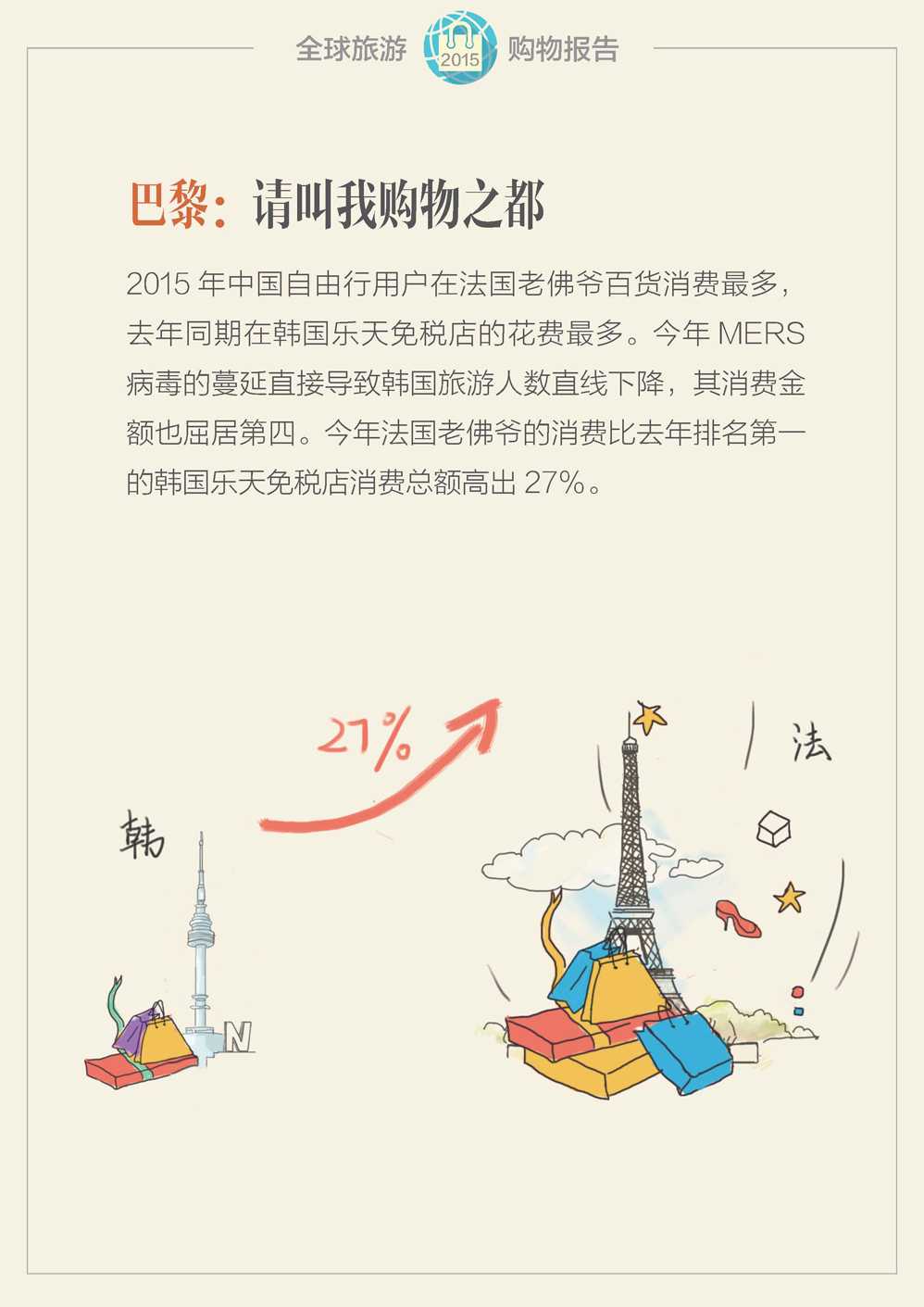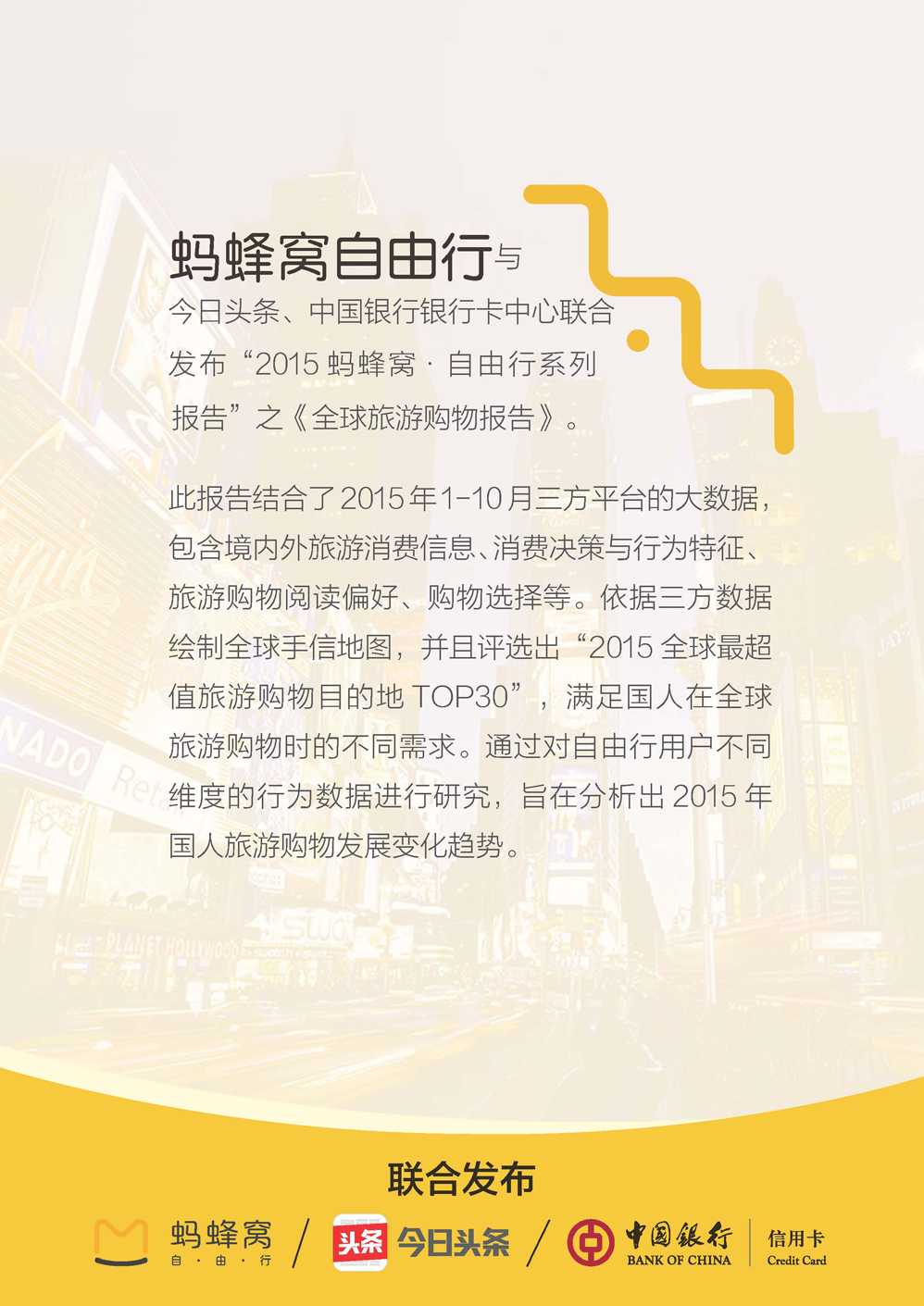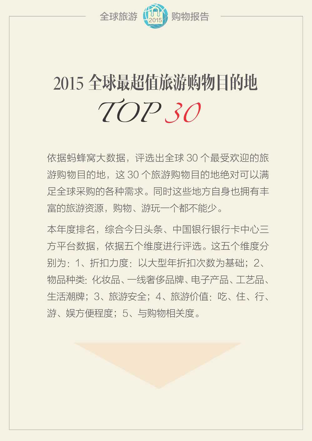 蚂蜂窝:2015年全球旅游购物报告 更多阅读:蚂蜂窝:2015年全球自由行旅游报告蚂蜂窝:2016全球自由行报告世界旅游组织:2015年全球旅游报告(附完整版)ComScore:2015年美国移动应用报告UN:2015年宽带状况报告2015年全球营养报告TripAdvisor:2016年全球旅游经济报告蚂蜂窝:2015年目的地旅游报告网易云阅读:2015年全球数字阅读报告世界经济论坛:2015年全球性别差距报告埃森哲:2015年全球能源架构绩效指数报告国际唱片业协会:2015年全球数字音乐报告2015年全球太空发射报告:高密度+可回收火箭出现世界银行:2020年第6期全球经济展望报告国际货币基金组织:2020年4月全球金融稳定报告