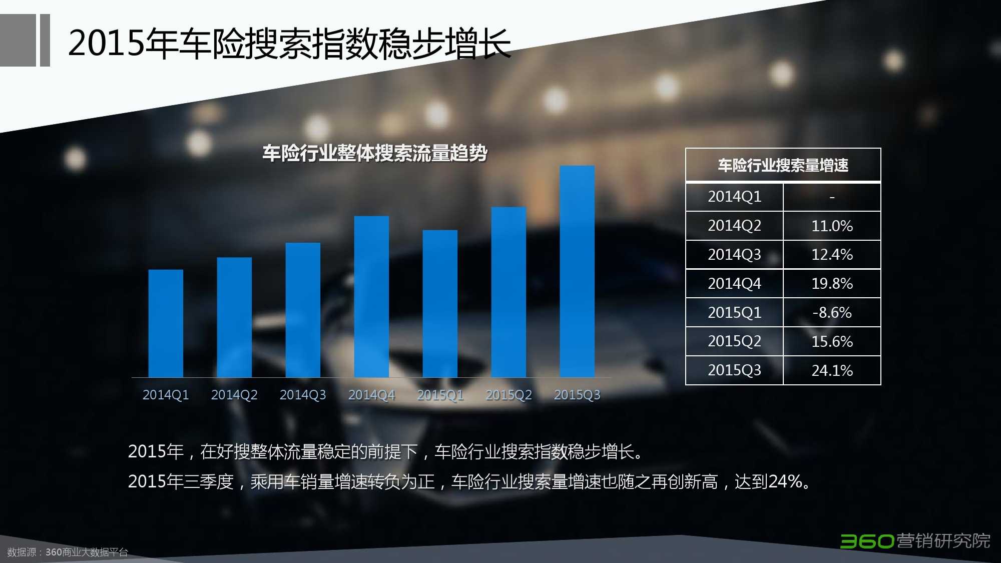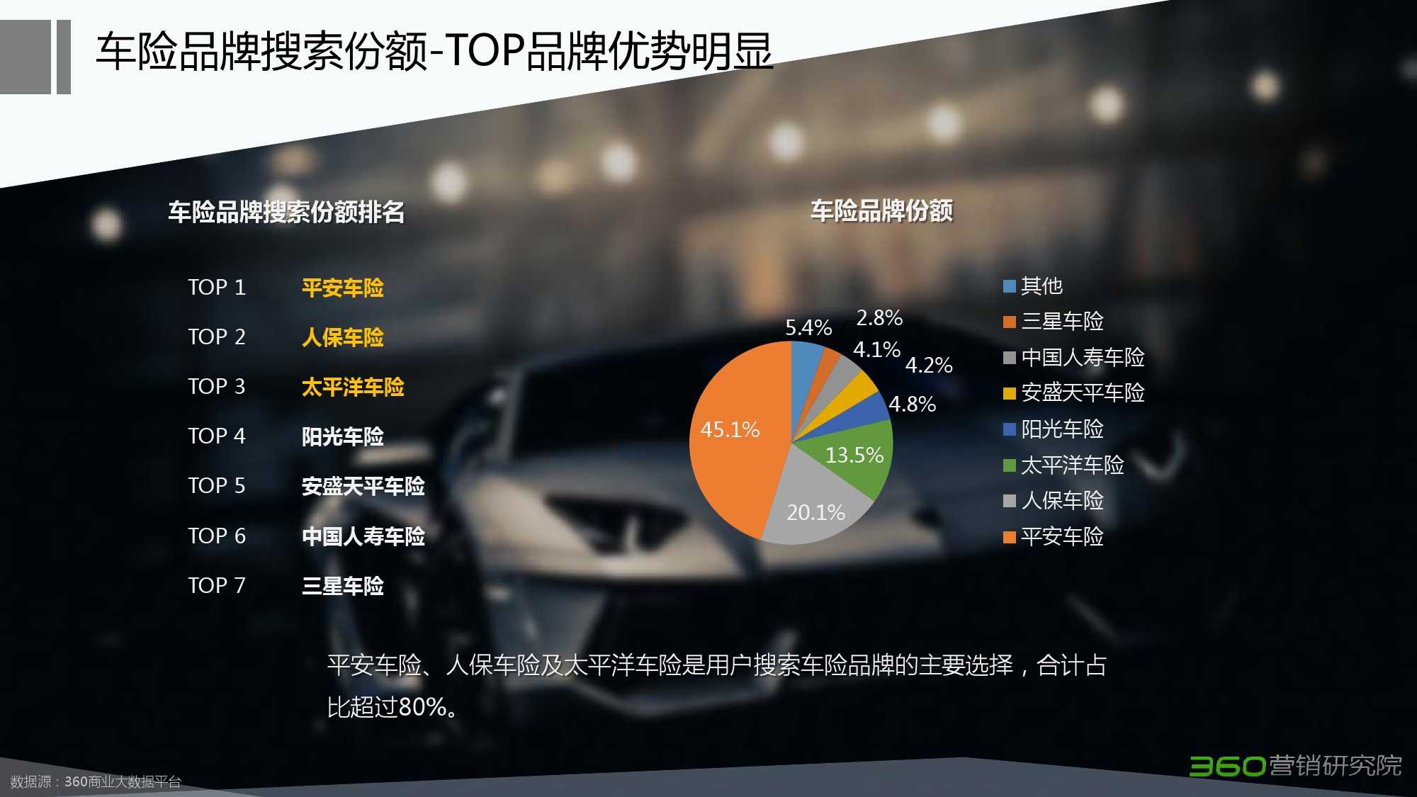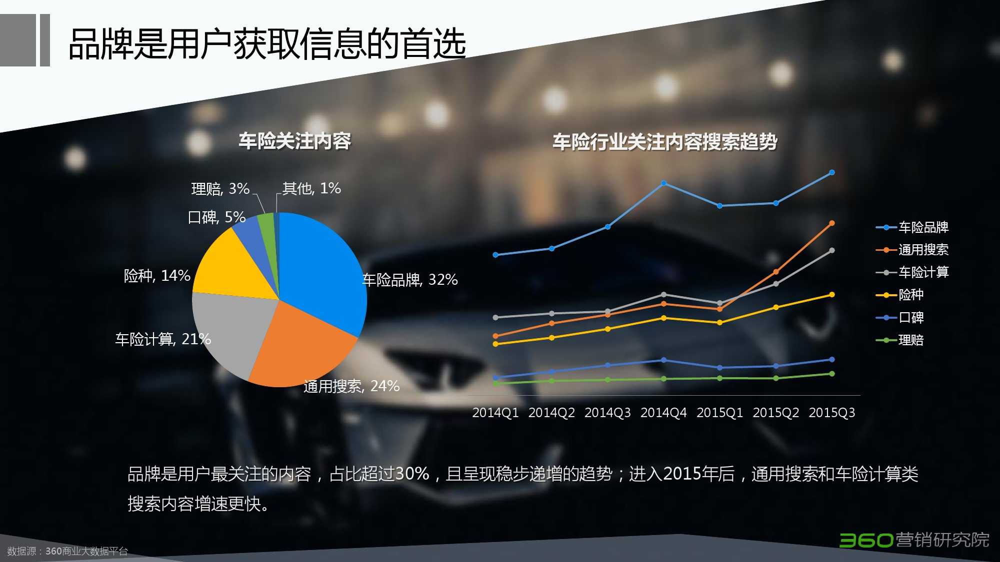 360:2015年Q3车险行业搜索市场研究报告 更多阅读:360:2015年Q1汽车行业搜索市场研究报告Hitwise:2013年6月360搜索市场份额为15.5%360:2015年Q2化妆品行业研究报告360:2015年第二季度P2P行业研究报告StatCounter:2014年12月Google美国搜索市场份额为75.2% 低于同期79.3%comScore:2014年6月美国桌面搜索市场份额首次跌破10%StatCounter:2024年10月谷歌搜索全球市场份额跌破90% 创9年来新低comScore:2013年8月份Google美国搜索市场份额达67%comScore:2012年5月雅虎美国搜索市场份额下降至13.4%Hitwise:2012年4月必应搜索引擎在美国搜索市场份额超过30%ComScore:2012年1月Google在美国搜索市场份额为66.2% 178亿次搜索comScore:2012年1月谷歌在美国搜索引擎市场份额升为66.2%comScore:2011年11月微软必应美国搜索市场份额达15%360:2014年奢侈品行业搜索市场分析报告(行业版)360:2015年医疗行业搜索行为研究报告