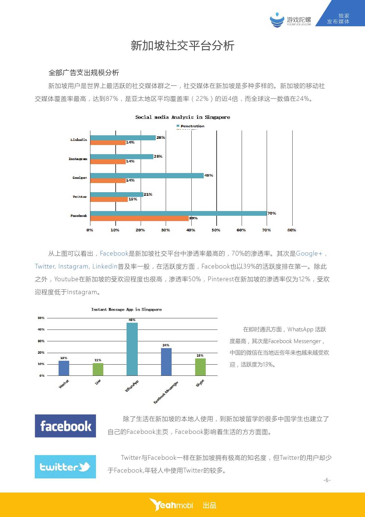 新加坡用户是世界上最活跃的社交媒体群之一,社交媒体在新加坡是多种多样的。新加坡的移动社 交媒体覆盖率最高,达到87%,是亚太地区平均覆盖率(22%)的近4倍,而全球这一数值在24%。