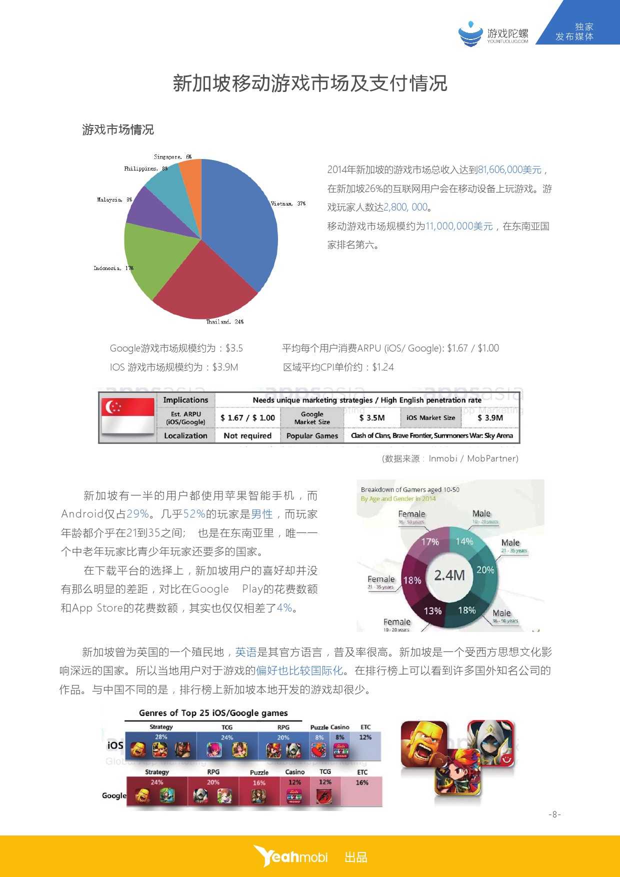 新加坡有一半的用户都使用苹果智能手机,而 Android仅占29%。几乎52%的玩家是男性,而玩家 年龄都介乎在21到35之间; 也是在东南亚里,唯一一 个中老年玩家比青少年玩家还要多的国家。