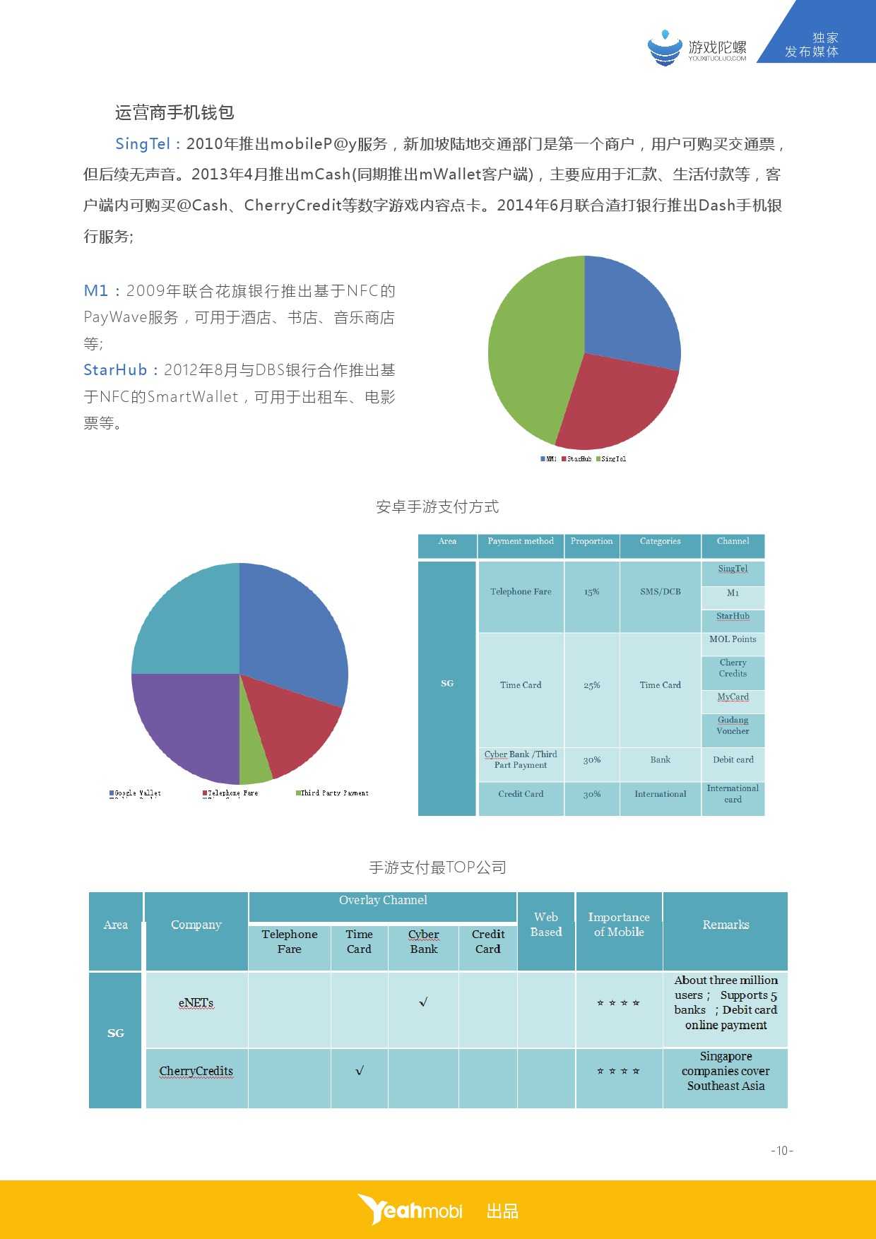 SingTel:2010年推出mobileP@y服务,新加坡陆地交通部门是第一个商户,用户可购买交通票, 但后续无声音。2013年4月推出mCash(同期推出mWallet客户端),主要应用于汇款、生活付款等,客 户端内可购买@Cash、CherryCredit等数字游戏内容点卡。2014年6月联合渣打银行推出Dash手机银 行服务;