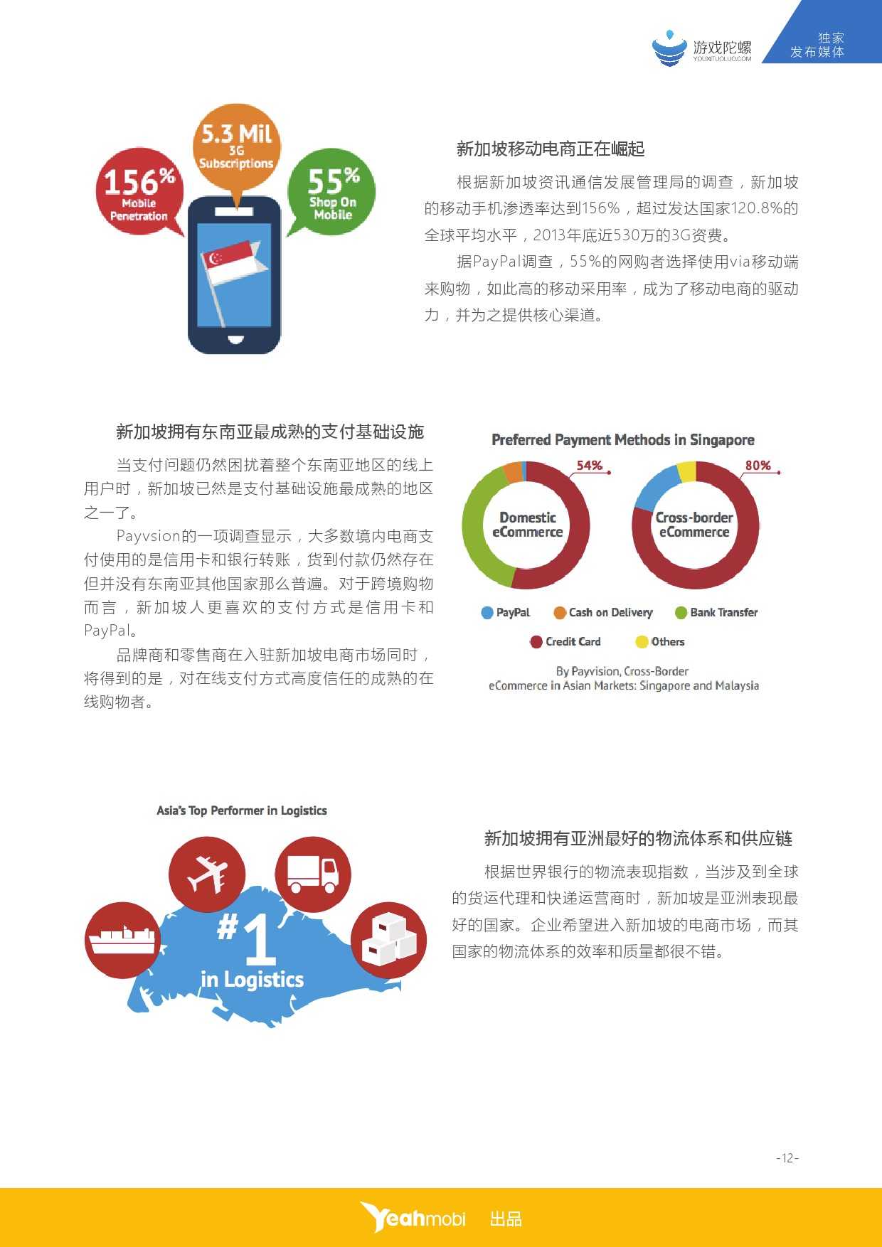根据新加坡资讯通信发展管理局的调查,新加坡 的移动手机渗透率达到156%,超过发达国家120.8%的 全球平均水平,2013年底近530万的3G资费。 据PayPal调查,55%的网购者选择使用via移动端 来购物,如此高的移动采用率,成为了移动电商的驱动 力,并为之提供核心渠道。