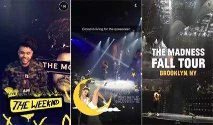 Snapchat成为了过去一年中最受欢迎的社交平台,大部分的用户都是00后和边缘人群。Snapchat筛选用户上传的照片和内容,包括他们的位置定位和赛事,比如CMA和AMA。甚至是艺人也使用这项功能,就像The Weeknd关注了他的新专辑Beauty Behind The Madness,Ariana Grande在洛杉矶iHeart Radio剧院的万圣节演出。