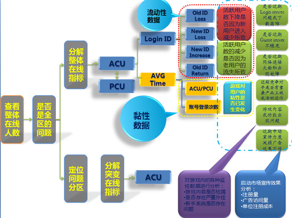 网游的常规数据的把握和检测更多的是针对人气(总登,峰值,APA,注册,流失,在线时长),消费(ARPU,充值,消耗,渗透率)。