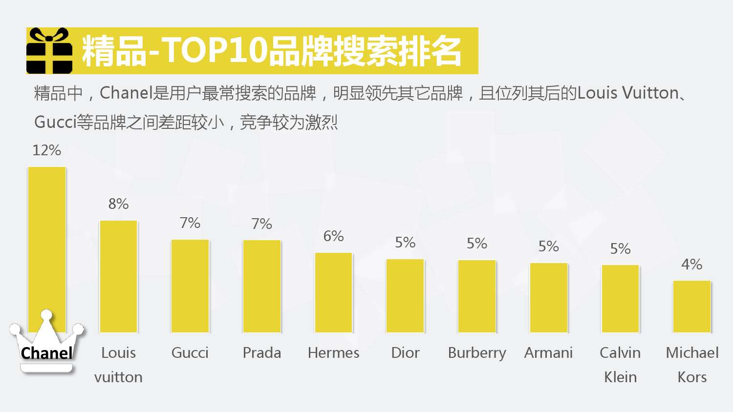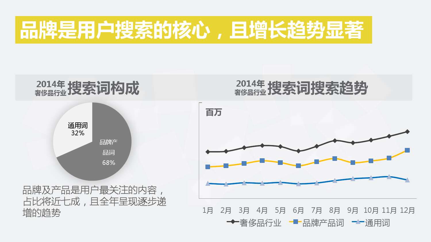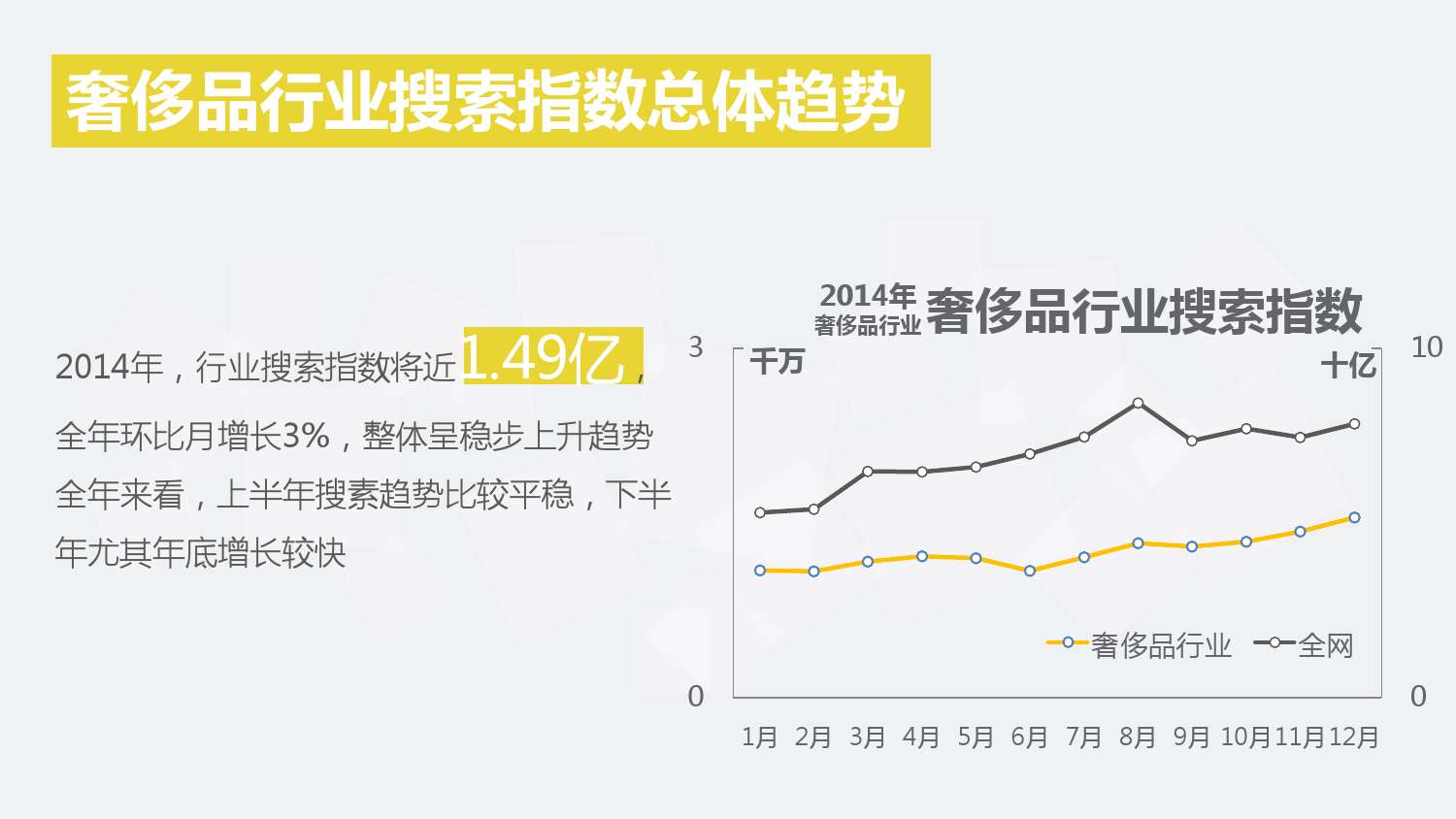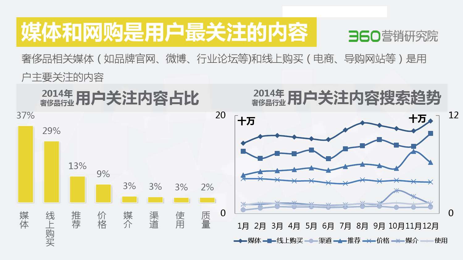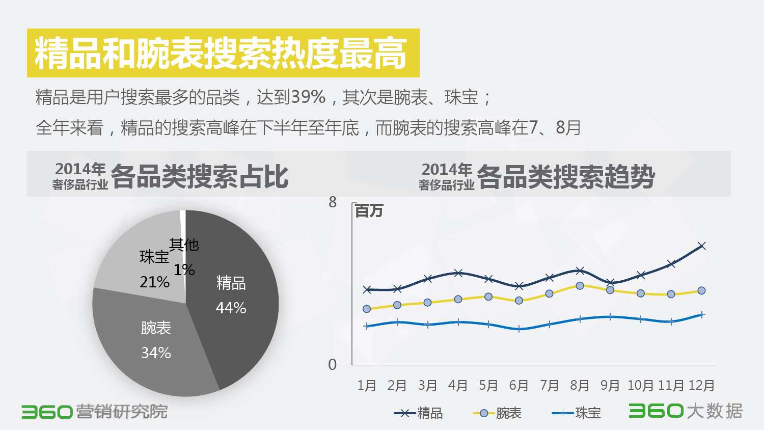 360:2014年奢侈品行业搜索市场分析报告(行业版) 互联网、移动互联对于奢侈品而言,更多的是机遇还是冲击?如何调整品牌管理和营销战略,才能适应竞争的需要?360营销研究院依托360大数据平台,通过对用户搜索行为的深入挖掘,了解和研究用户奢侈品需求关注点及发展趋势,为企业未来的市场营销策略提供支持。 更多阅读:百度研究中心:2012年度奢侈品行业用户搜索研究报告360:2015年Q1汽车行业搜索市场研究报告360:2015年医疗行业搜索行为研究报告360:2015年Q3车险行业搜索市场研究报告360:2014年Q3汽车行业搜索研究Hitwise:2013年6月360搜索市场份额为15.5%2015年奢侈品行业大数据讯飞:2021年奢侈品行业图鉴报告2019-2020中国奢侈品行业社媒营销趋势关键词大数据解读:过去一年奢侈品行业都发生了什么法国巴黎银行:奢侈品行业十大危机360:2023年上半年度男性诈骗受害者人均损失高达4.8万元360财报:2022年Q1-Q3 360营业收入69.35亿元 同比下降18.79%360:2021年上半年度中国手机安全状况报告360:2019 智能网联汽车信息安全年度报告