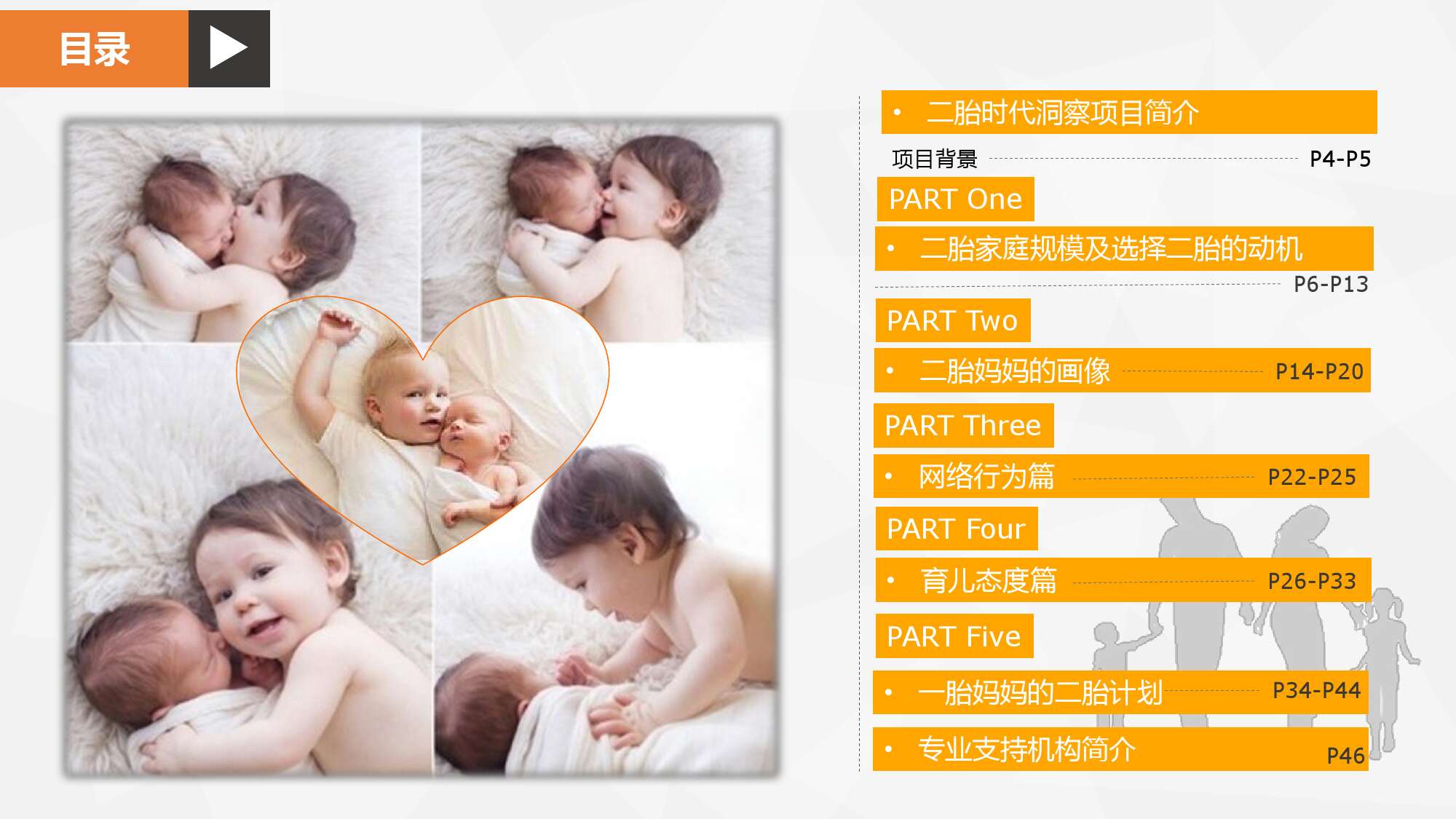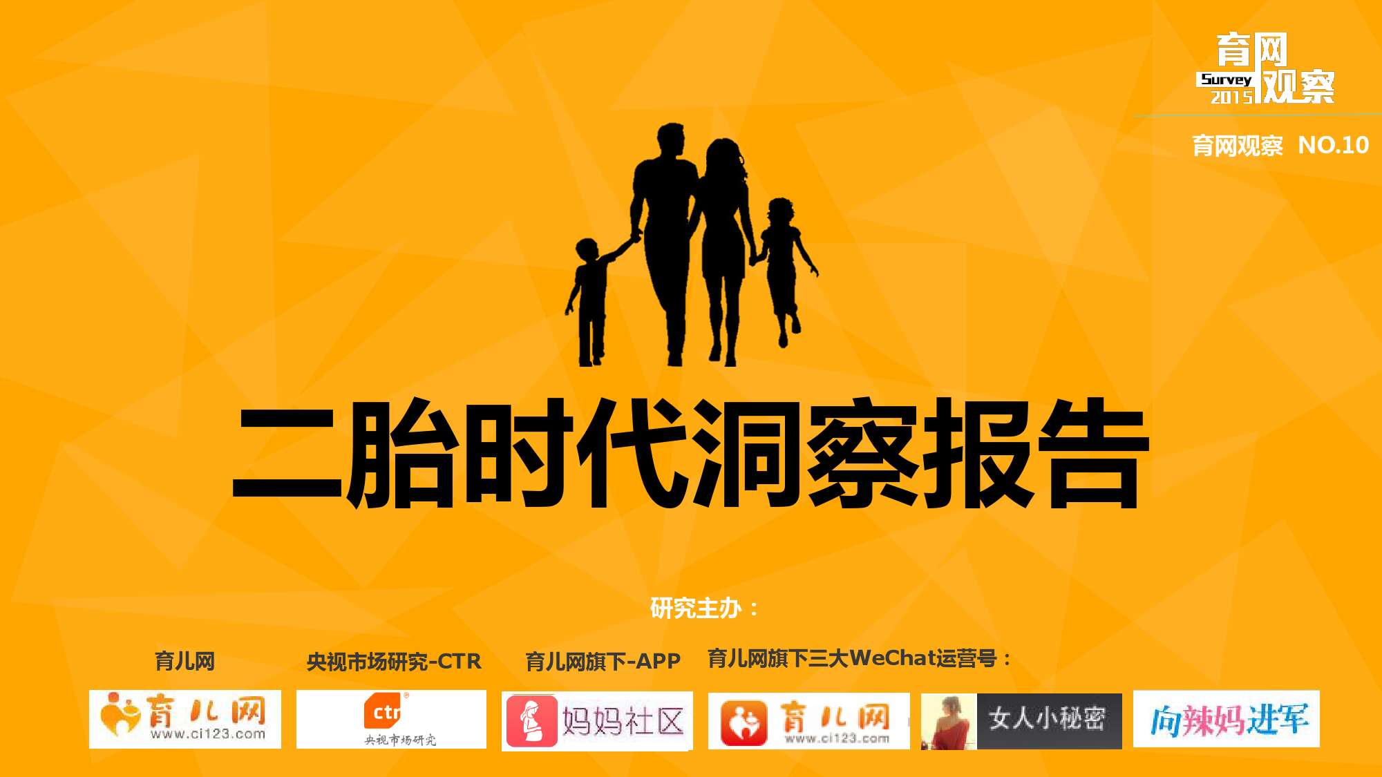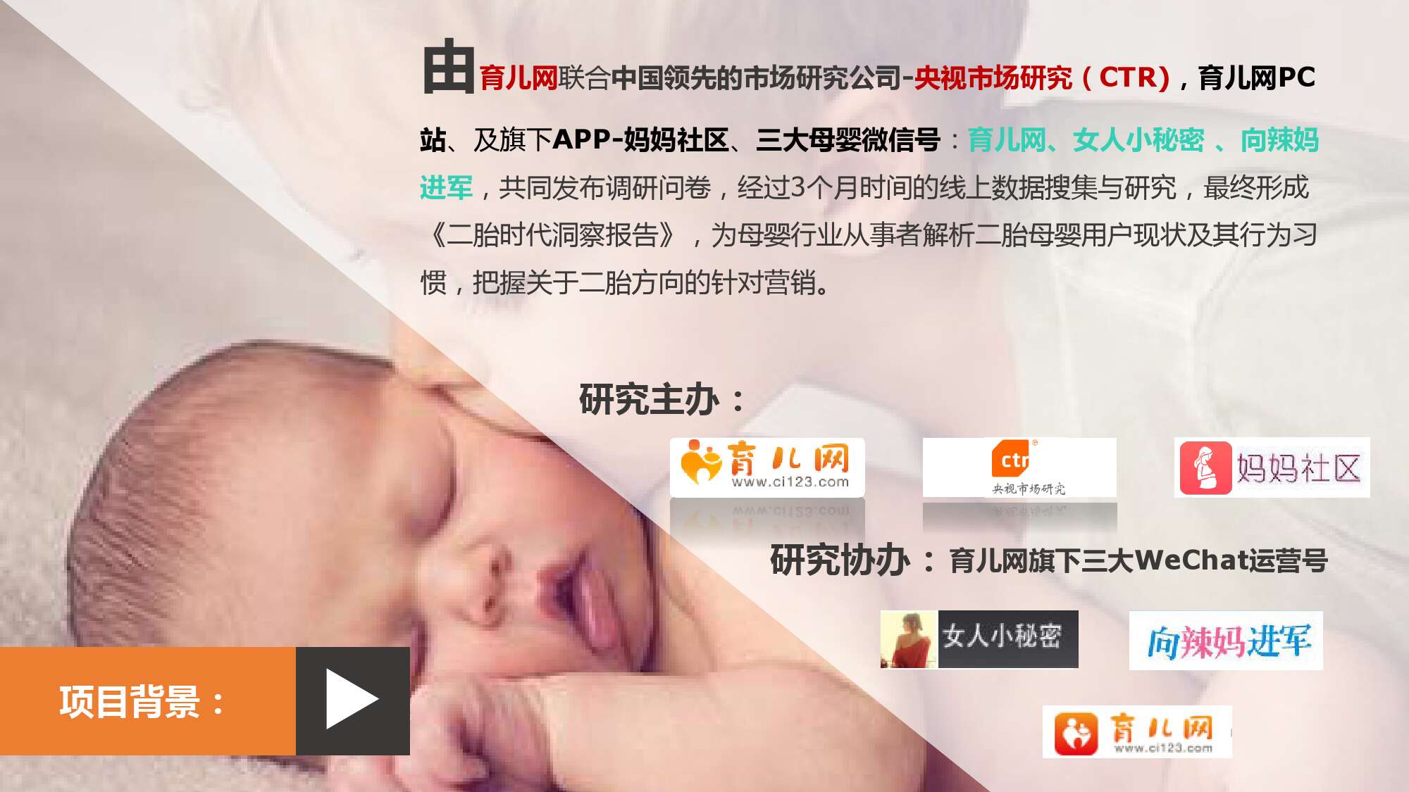 10月,育儿网联合领先的市场研究公司-央视市场研究(CTR)共同发起二胎调研,共有35308个妈妈*参与调研,并历时3个月研究分析,发布《二胎时代洞察报告》,报告透过大数据深度洞察全面二孩时代的妈妈人群,解析一胎妈妈的二孩计划、二胎妈妈的现状和行为习惯,为全面二孩时代的妈妈人群重新画像,为母婴品牌取胜市场提供营销与决策参考。