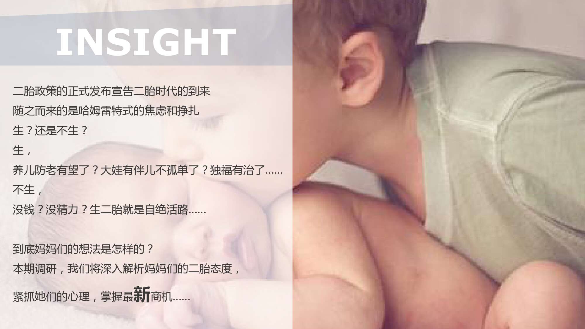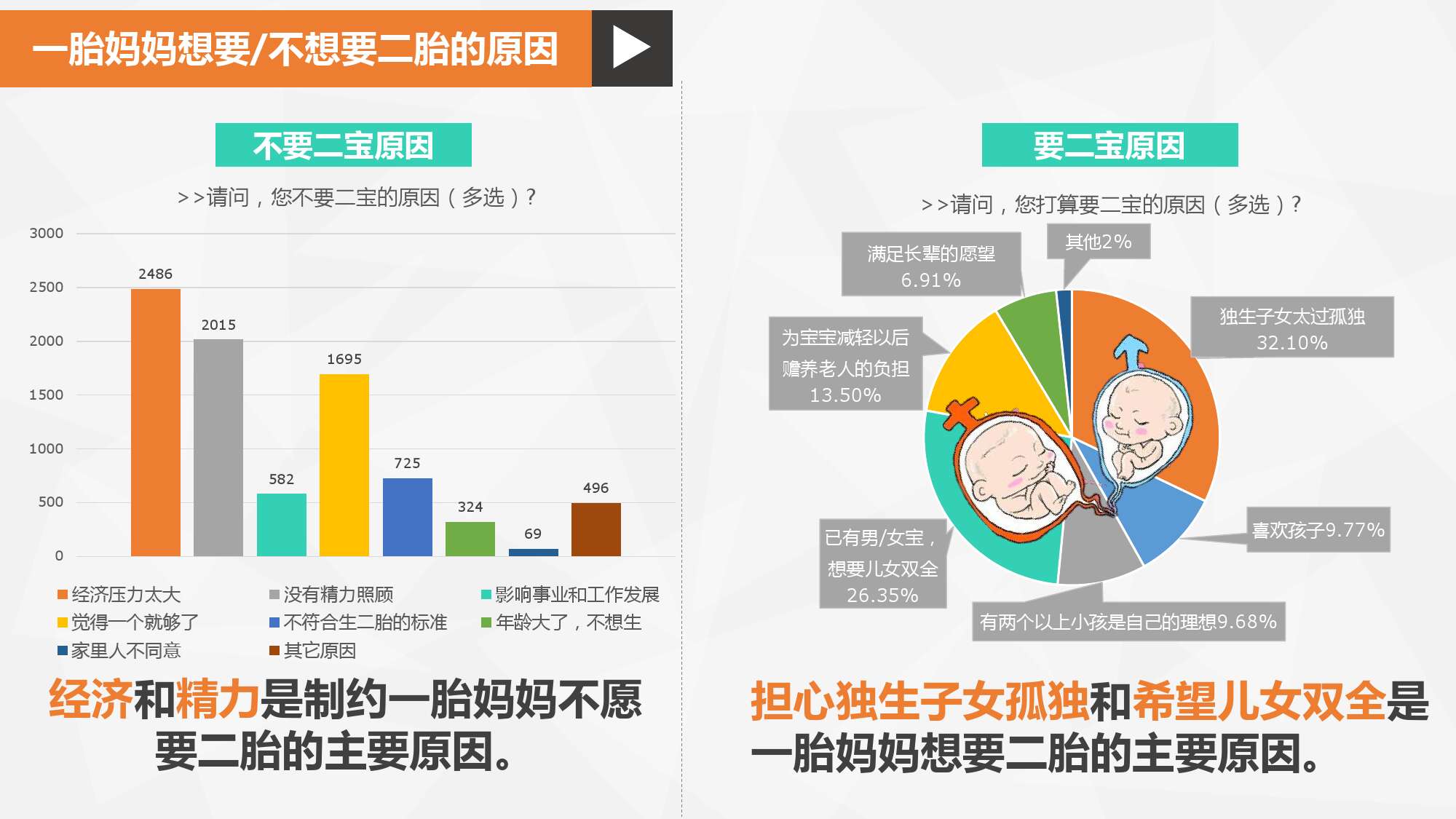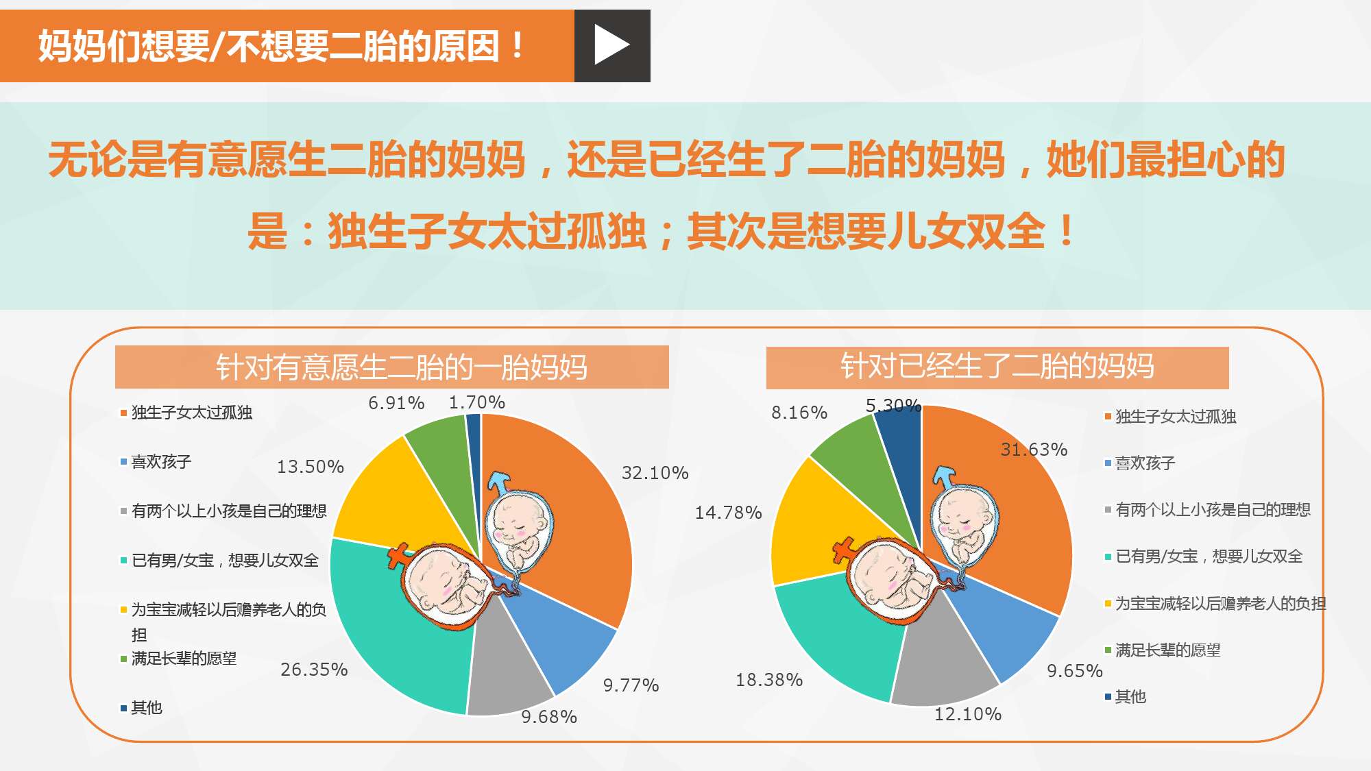 一、不愿孩子孤单,认为孩子需要更多陪伴。报告显示,32%已有二胎及有意愿要二胎的妈妈们要二胎的首要原因,是认为独生子女太过孤独。从另一个方面来说,让孩子从小有陪伴,是现代父母的迫切需求。对品牌来说,无论是对一胎还是二胎家庭,营销形式都可以选择传递更多的陪伴意义。对一胎家庭传递的陪伴意义,可以侧重家庭之外的孩童社交,如多个家庭共同参与的亲子活动联谊,对二胎家庭的陪伴意义,则可以侧重家庭之内的二孩相处。