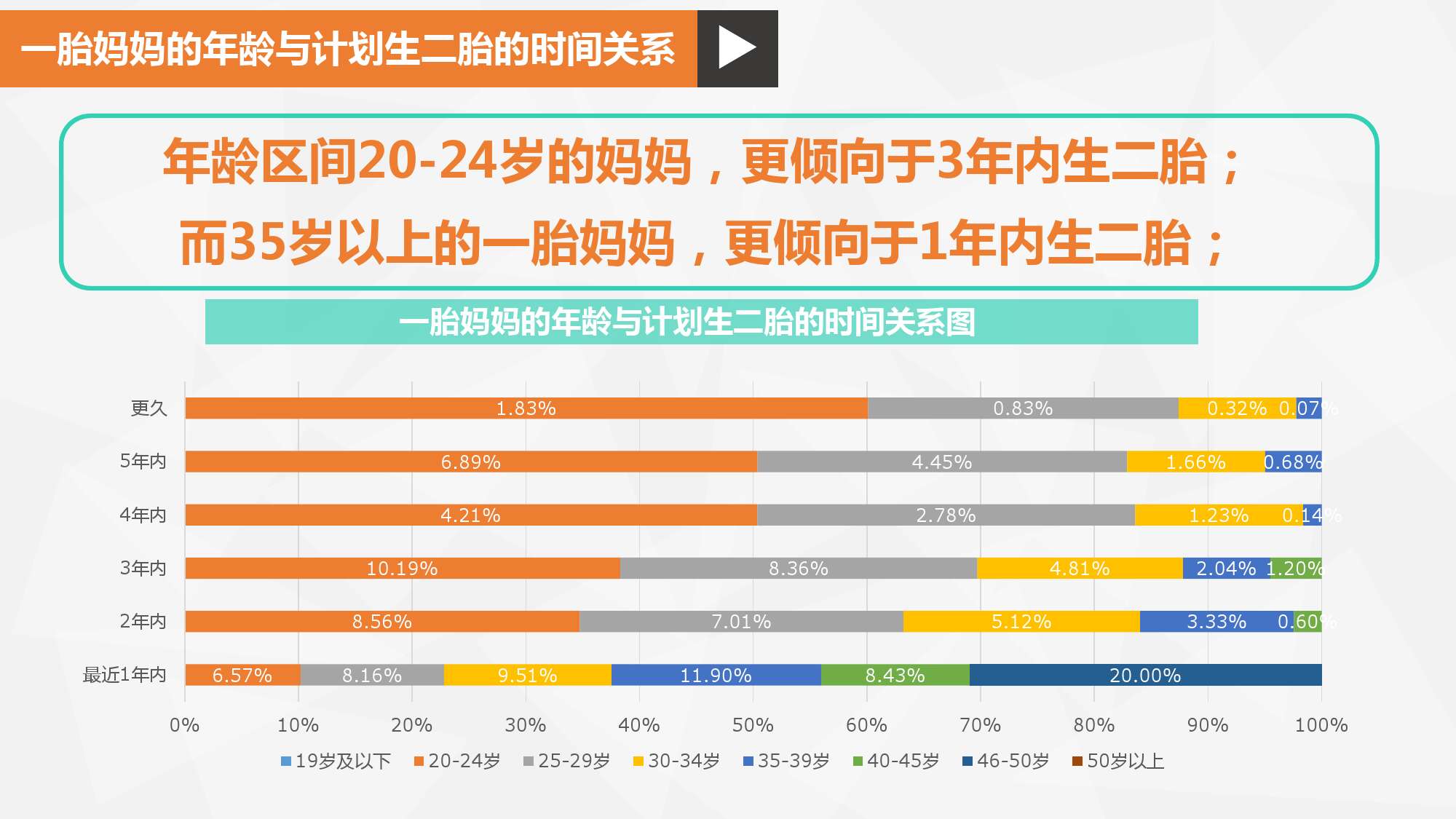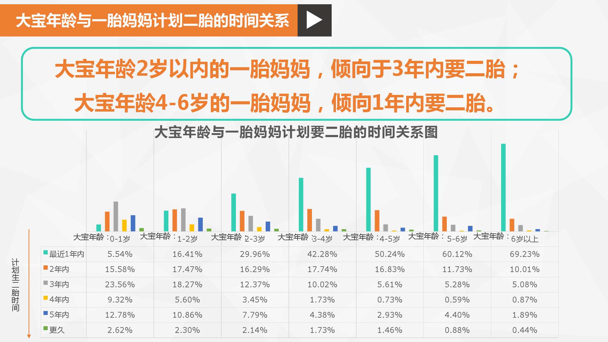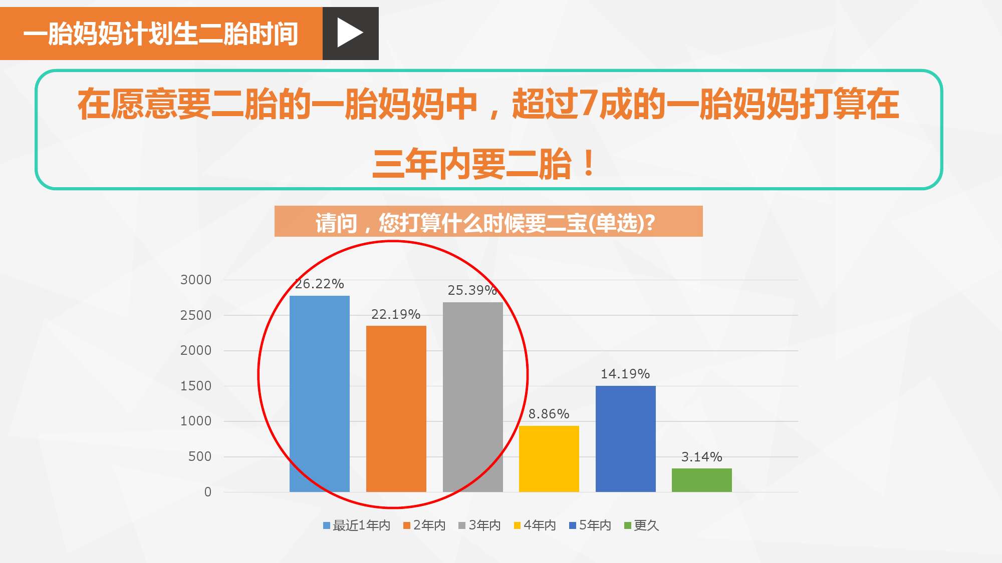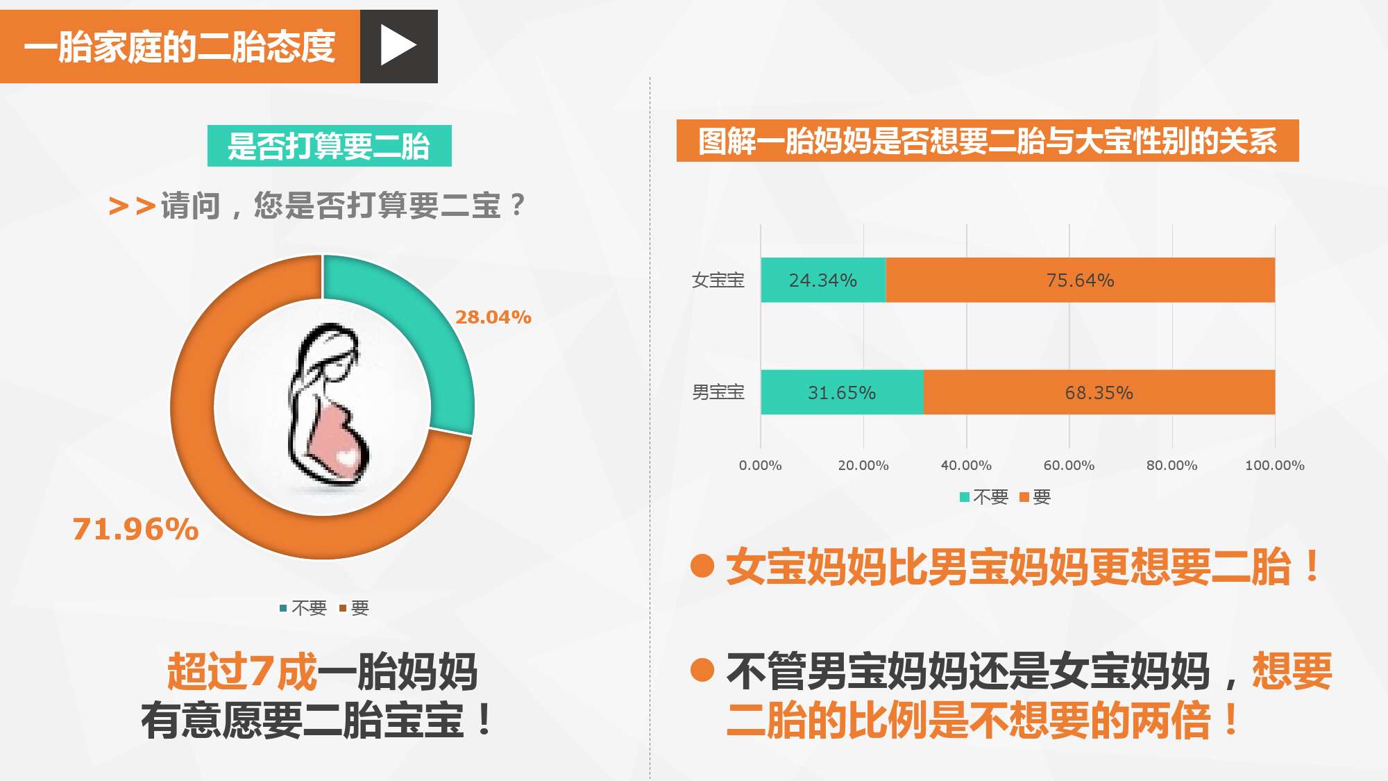 报告发现,7成一胎妈妈想要二胎,其中又有超过7成的妈妈计划在3年内要二胎,全面二孩政策的出台和正式实施,将更进一步促使一胎妈妈”想要二胎”成为”有二胎”。