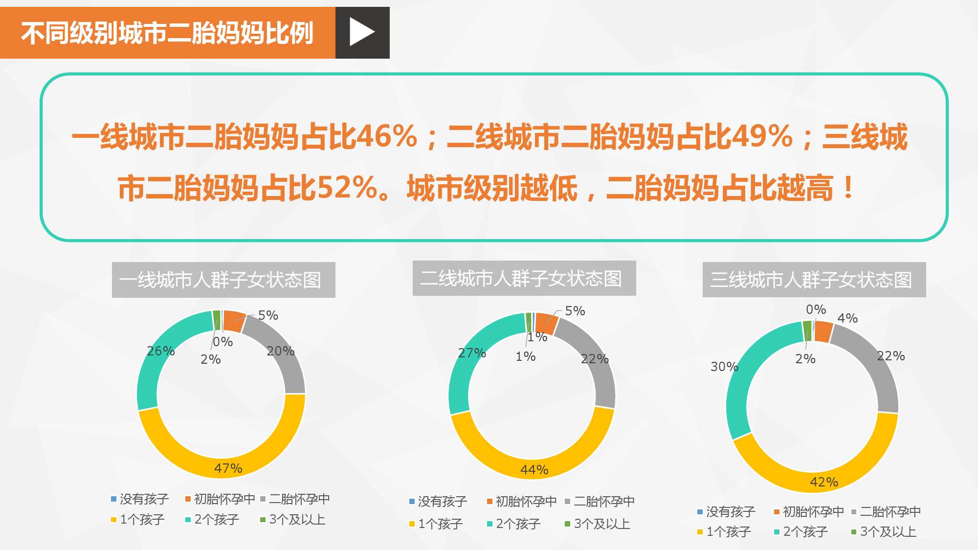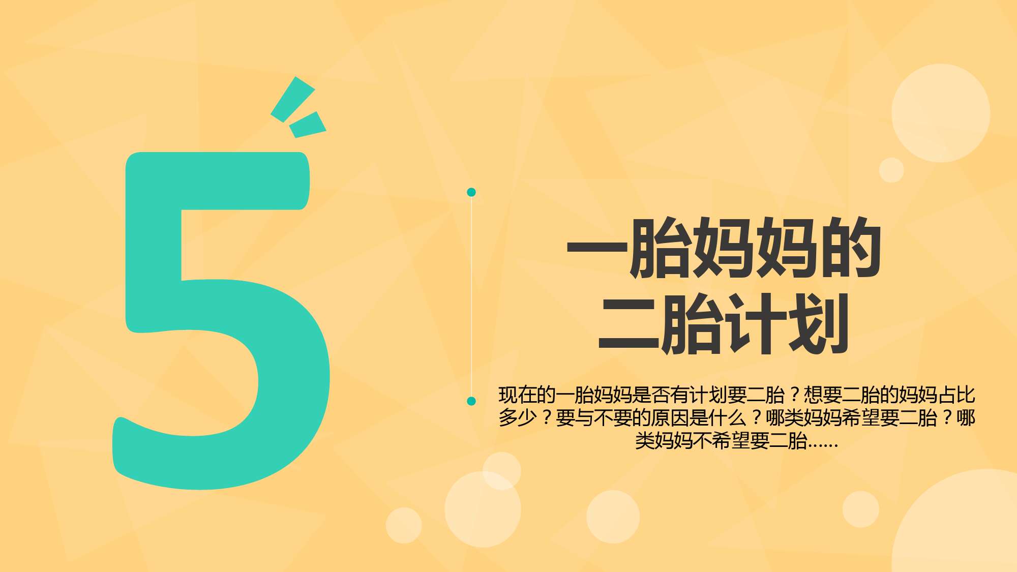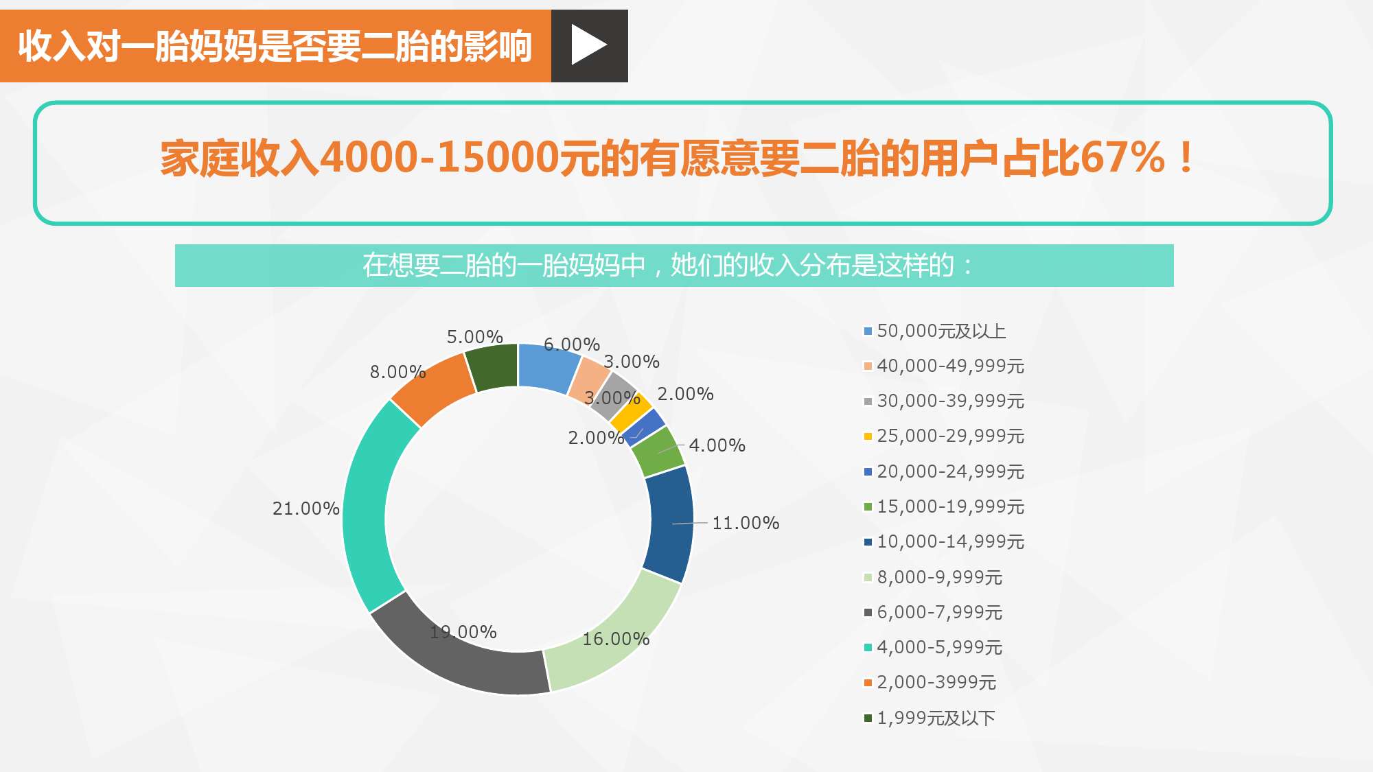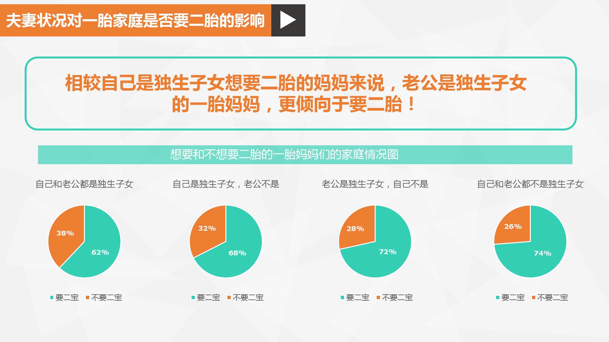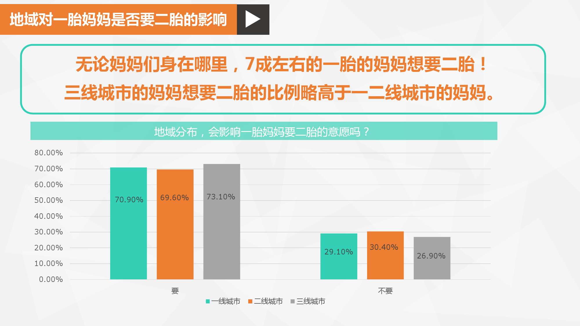 报告发现,7成一胎妈妈想要二胎,其中又有超过7成的妈妈计划在3年内要二胎,全面二孩政策的出台和正式实施,将更进一步促使一胎妈妈”想要二胎”成为”有二胎”。