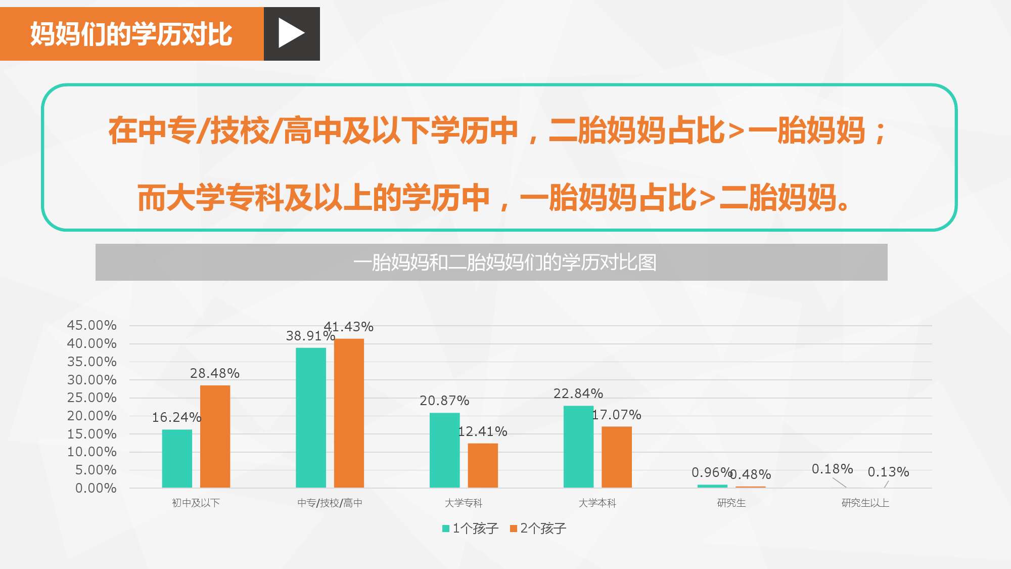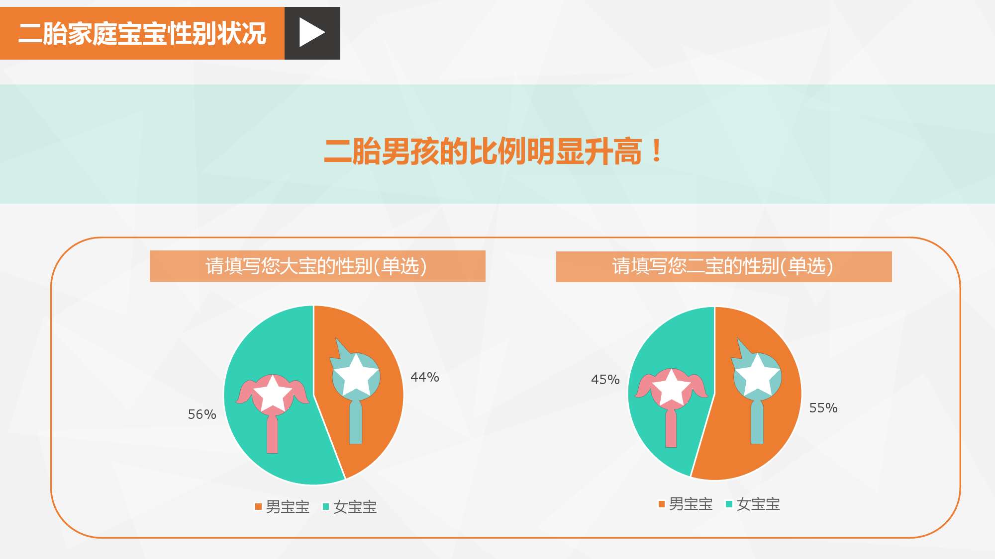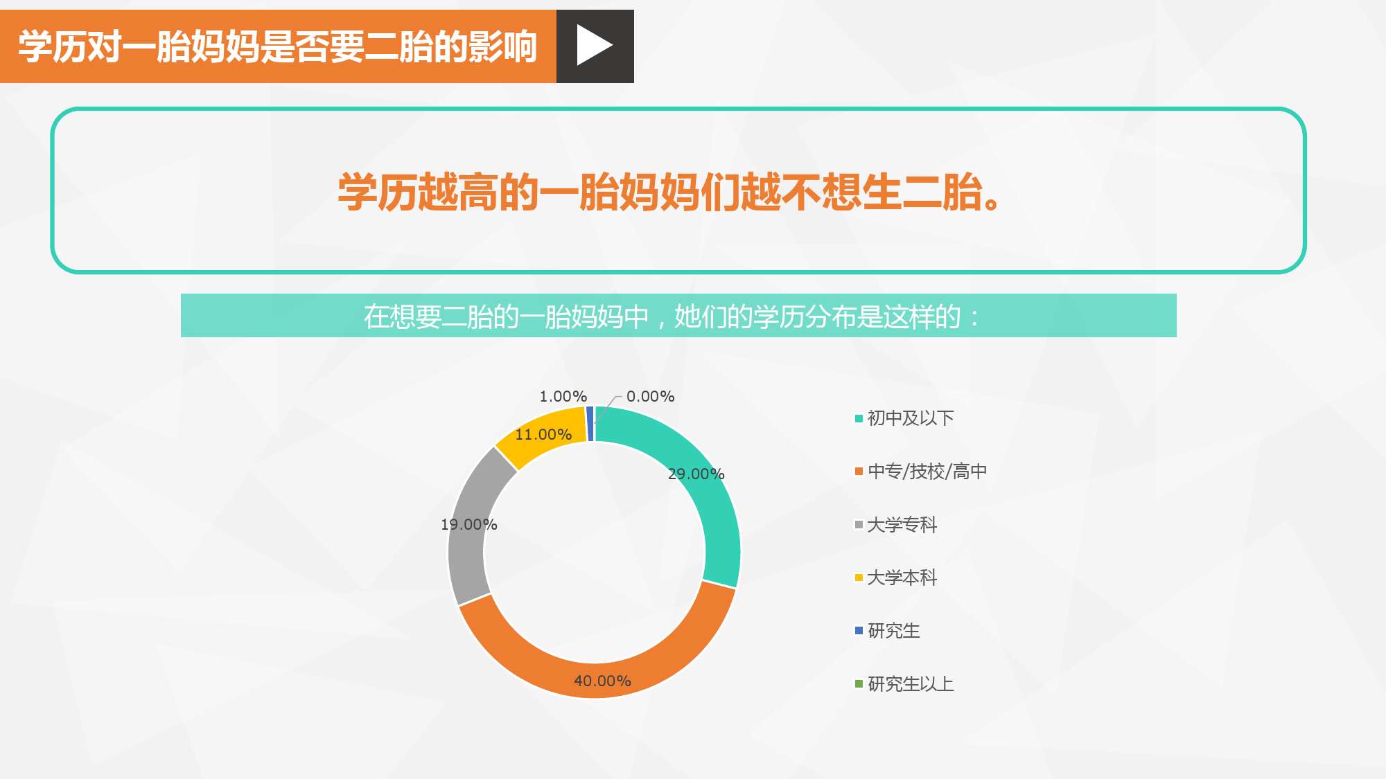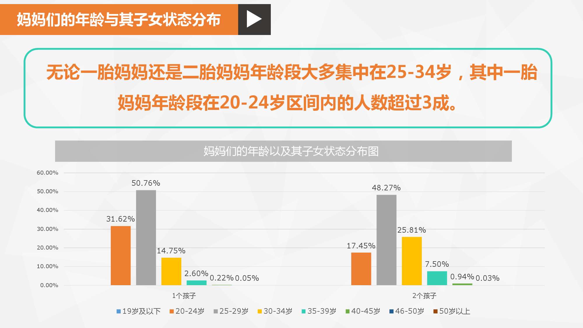 报告发现,7成一胎妈妈想要二胎,其中又有超过7成的妈妈计划在3年内要二胎,全面二孩政策的出台和正式实施,将更进一步促使一胎妈妈”想要二胎”成为”有二胎”。