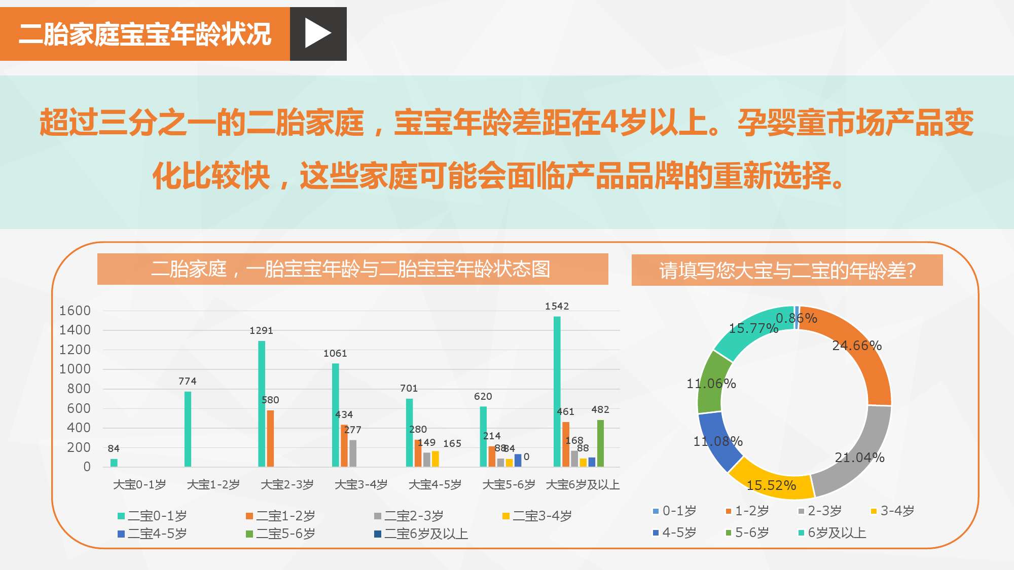 另一方面,在现有的二胎家庭中,近4成家庭的2个孩子年龄差在4岁以上,多数一胎母婴用品已不具备再利用价值,二胎妈妈直接面临母婴产品品牌的重新选择。而有意向在1年内要二胎的一胎妈妈中,大孩年龄集中在3-6岁,意味着1年内她们将和二胎妈妈面临同样的选择。
