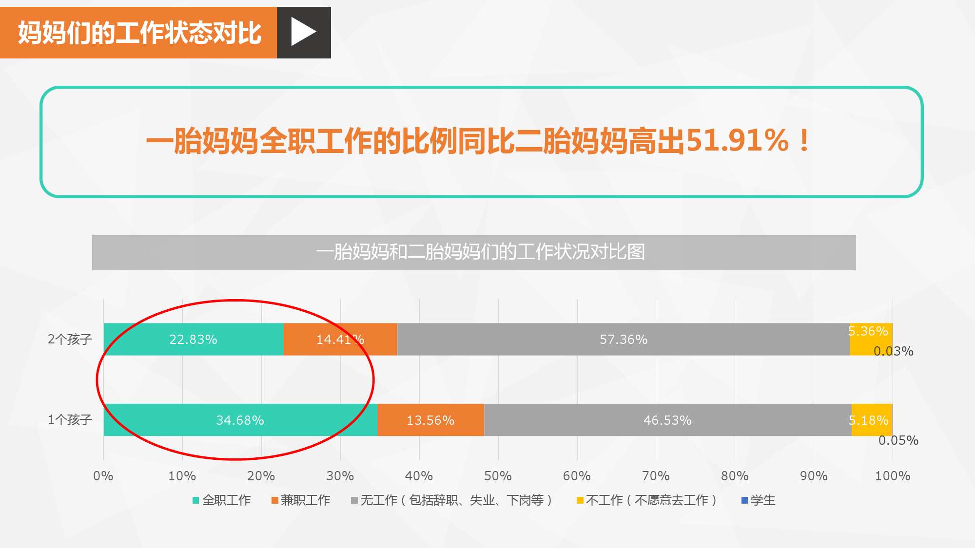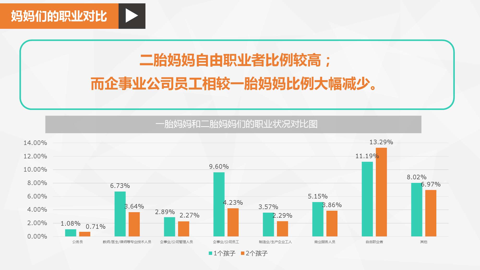 四、重心更转移家庭,需要更多家庭关怀。56%的妈妈有了孩子之后不再工作,将生活重心放在家庭上。她们认为有条件的话,愿意全职在家照看孩子,不惜放弃个人的时间、事业或爱好。30%的妈妈仍是全职工作状态,对比一胎和二胎妈妈们,我们发现:一胎妈妈全职工作的比例比二胎妈妈高出51.91%。二胎妈妈重心更转移家庭,家庭任务更重,但也相对职场妈妈拥有更多可支配时间和家庭消费决策权。品牌对二胎妈妈的家庭关怀,如辅助妈妈高效平衡二胎家庭任务,更能获得二胎妈妈好感。