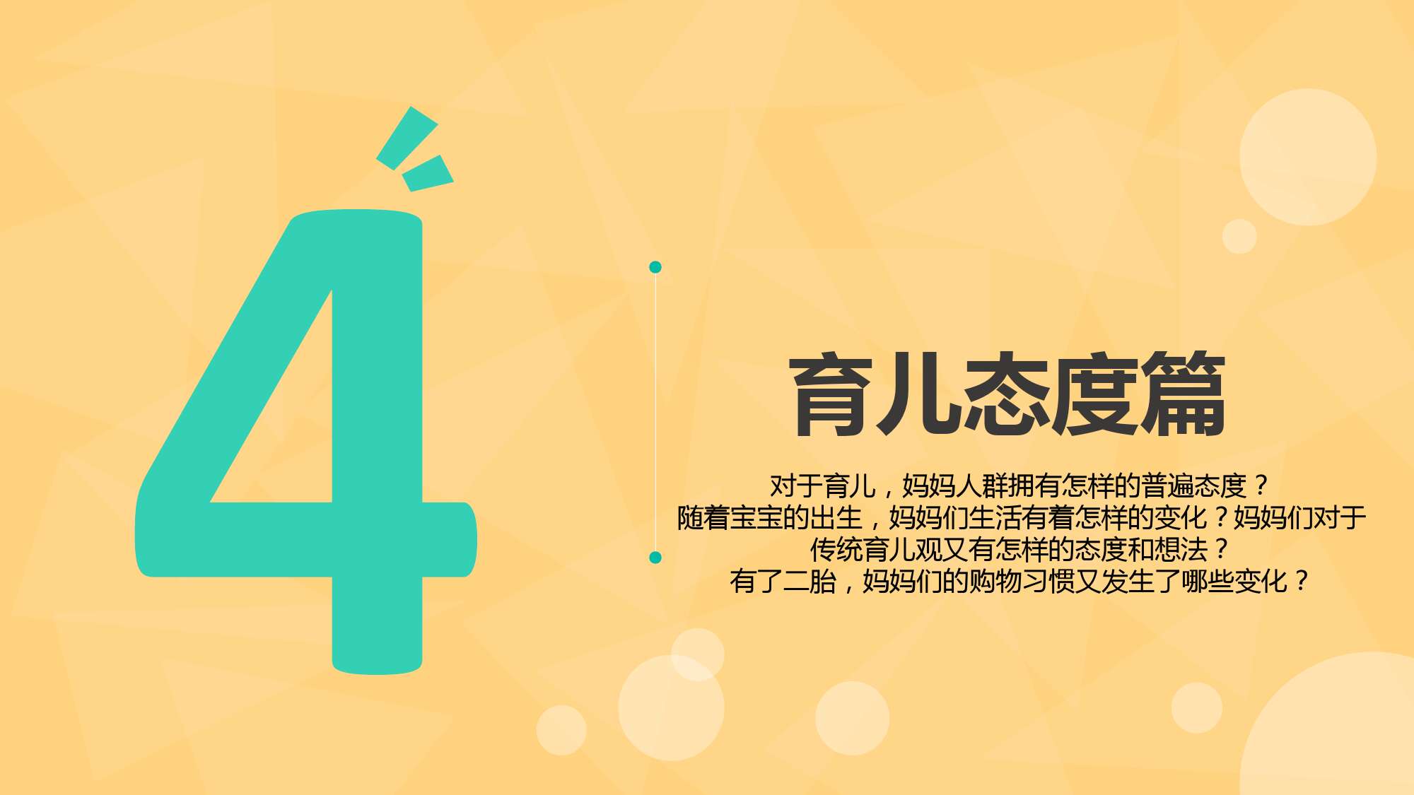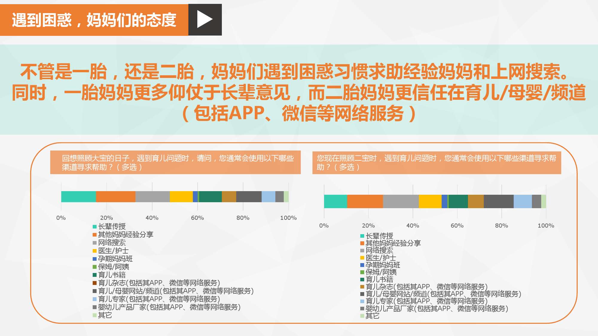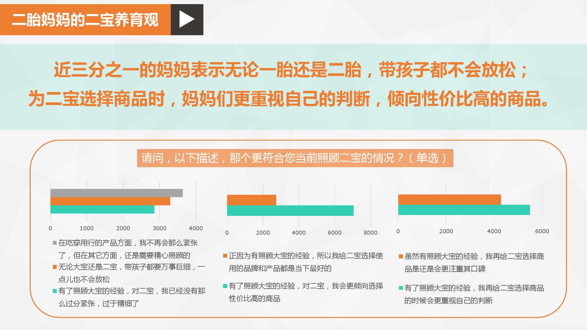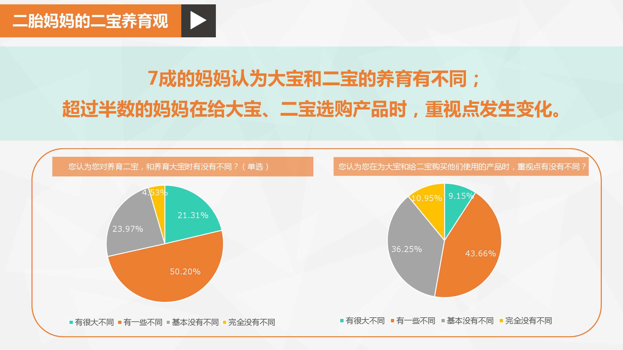 三、心理上更自信了,需要更多肯定与赞同。二胎妈妈心理上最大的转变,是基本脱离一胎新手妈妈的状态,育儿更有自己的想法了。56%的二胎妈妈认为有了照顾大宝的经验,相比外界的口碑或建议,再给二宝选择商品的时候会更重视自己的判断。品牌并非要因此轻视口碑或达人专家效应,而是可以在此基础上,对二胎妈妈的各种选择,表达对二胎妈妈的肯定与赞同,以此获得二胎妈妈的好感与认同。