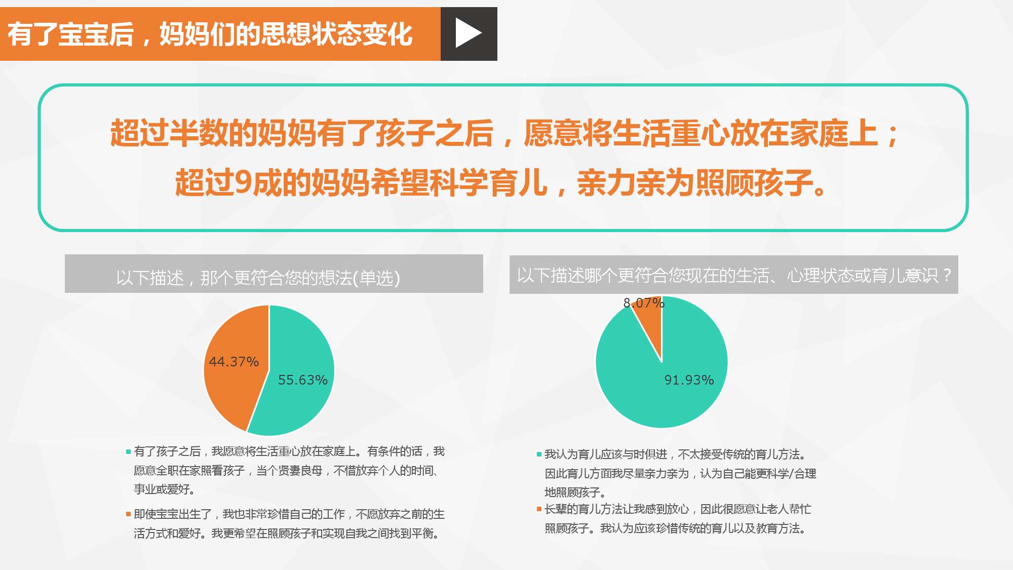 二、崇尚科学育儿,需要更多专业指导。在问及育儿意识时,92%的妈妈认为,育儿应该与时俱进,不太接受传统的育儿方法,她们在育儿上亲力亲为,认为自己更能科学/合理地照顾孩子。对品牌来说,建立专业的品牌形象,能给妈妈提供专业的育儿指导的营销形式,虽然保守,也能触及妈妈们的心理需求。