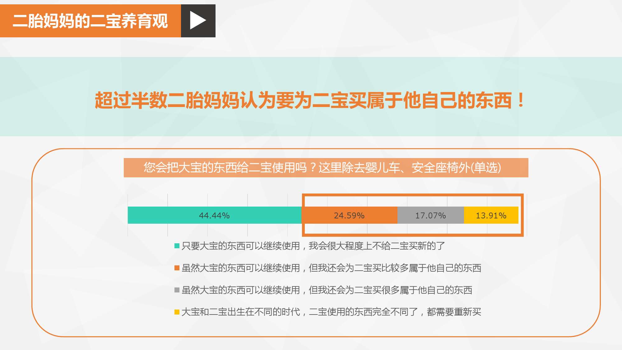 而”小孩子用大孩子的”传统在新时代妈妈的二胎用品选择中已不再占据优势,56%的妈妈认为,虽然大宝的东西可以继续使用,但还会为二宝买比较多属于他自己的东西。