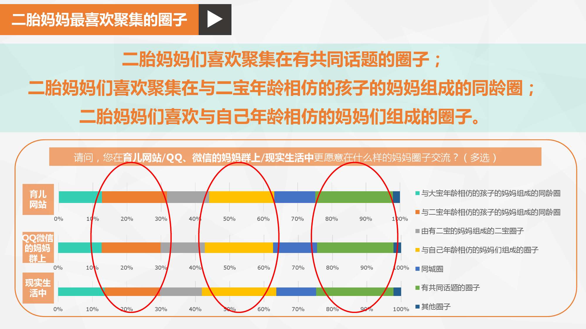 品牌常常通过形象代言人或目标妈妈群体所在的圈子与妈妈们进行品牌沟通,对此,报告对二胎妈妈在育儿网站、QQ或微信的妈妈群及现实生活的圈子做了调研分析,在这三个不同平台、同领域的偏好习惯上,二胎妈妈最喜欢与最常驻留的圈子依次是A.有共同话题的圈子;B.与二宝年龄相仿的孩子的妈妈组成的同龄圈;C.与自己年龄相仿的妈妈们组成的圈子。