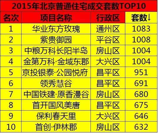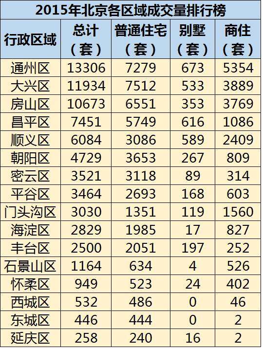 数据显示,2015年北京只有3个区新房成交量过万,分别是通州区、大兴区、房山区,其成交量分别是13306套、11934套、10673套。