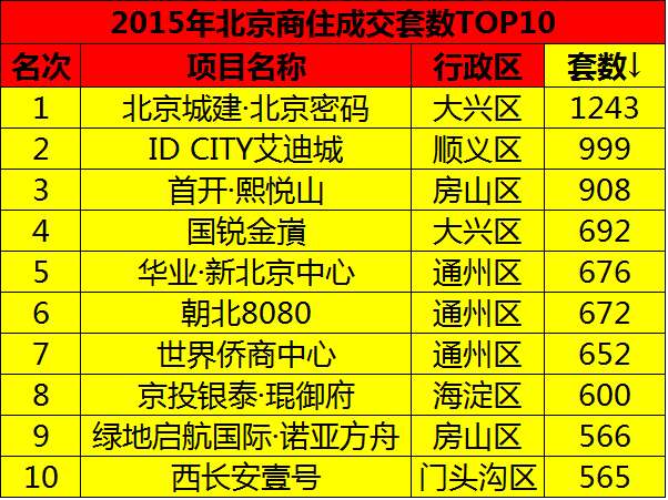 从排行榜来看,2015年北京城建·北京密码以成交1243套房源成为《2015年北京商住成交套数TOP10》冠军,是唯一一个成交量超过1000套的商住产品,亚军是艾迪城,成交999套。