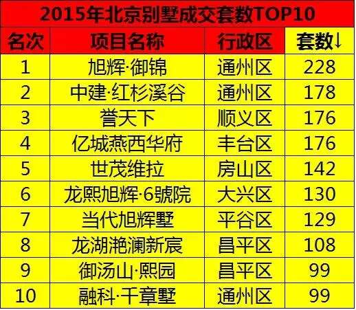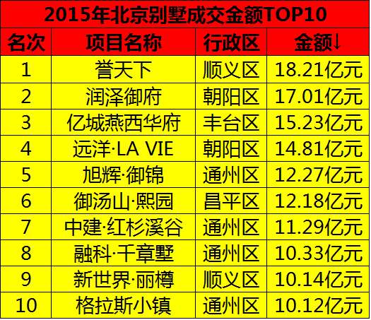 誉天下则以18.21亿登上《2015年北京别墅成交金额TOP10》榜首;屈居第二名的是润泽御府,成交金额为17.01亿。