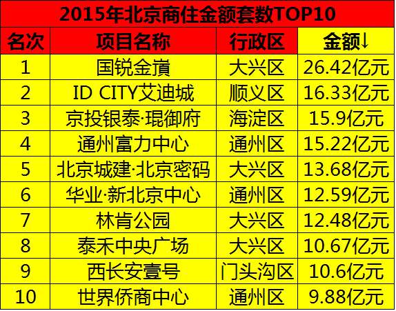 国锐金嵿2015年成交金额为26.42亿,力压成交金额为16.33亿的艾迪城,以绝对优势稳坐《2015年北京商住金额套数TOP10》第一名。