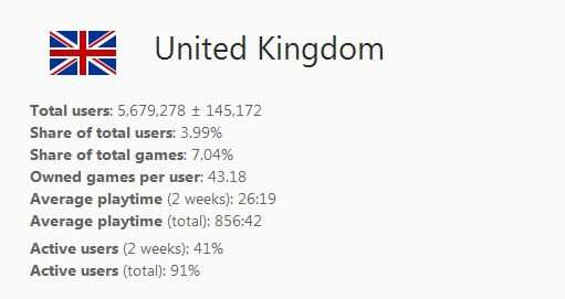 Steam中国用户数量突破600万 超越英国 自从Steam商店支持人民币结算以来,Steam中国区几乎就成了低价区,《GTA5》等热门游戏的半价销售策略以及近来的圣诞节特惠促销,成功吸引到了大批中国玩家。 日前,据国外网站SteamSpy的统计数据,中国目前约有600万(具体数字为6197136±149718)已激活的steam账号,但是中国Steam用户平均每人拥有8款游戏,对比其他国家游戏拥有量较低。 此外,目前美国的Steam激活用户为2400万,而英国的Steam激活用户为570万,从数据来看,中国的Steam正版玩家数量已经超越英国。 更多阅读:《赛博朋克2077》Steam好评率83%!在线人数破90万Steam:2024年10月RTX 3060仍是最受欢迎的显卡 占据7.46%的份额《赛博朋克2077》Steam首发玩家数突破41万 不断飙升《赛博朋克2077》PC版已解锁 在线人数峰值突破70万英国经济分析师:1977至2020年游戏平均相对价格每年下降近2%Valve:2022年3月Steam日语用户占比为2.34% 月增幅23.80%Steam:2022年3月21日至3月27日销量榜 《艾尔登法环》获得五连冠Steam:《艾尔登法环》连续三周霸榜 无悬念蝉联Steam销量冠军SteamDB:2022年3月《艾尔登法环》同时在线峰值超95万SteamDB:2021年11月Steam同时在线用户达2700万 创历史新高V社:Steam国区《完蛋!我被美女包围了》力压《使命召唤》拿下冠军SteamDB:2022年1月Steam同时在线人数达2920万人 再创历史新高2022年1月9日Steam平台同时在线人数首次突破2800万Steam:2021年12月软硬件报告 玩家最常用操作系统仍是Windows 102021年1月2日Steam在线人数峰值近2800万人