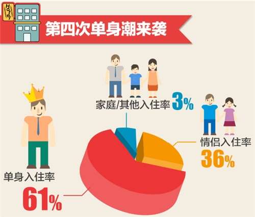 第四次的单身潮中,中国单身男女数已近2亿,而这股浪潮在百度地图2015榜单数据上也显现得十分汹涌。数据显示,单身才是酒店开房主力,在酒店入住用户中占比61%,情侣只能以36%的入住率退居其次,家庭及其他群体入住率为3%。看来,以后酒店营销更要重视吸引单身群体注意力了呢。