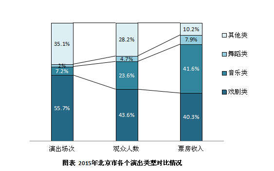 2015年,北京市营业性演出市场的状况及各类专业数据统计资料,来自于北京演出行业协会对全市135家主要从事营业性演出场所的统计(比上一年度新增了5个剧场。其中还包括各类小剧场、各郊区县影剧院共56家),以及相关票务公司、演出机构提供的部分演出市场有关信息。