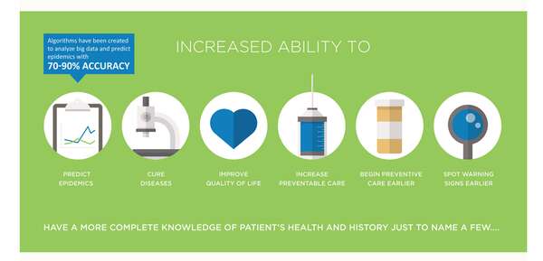 大数据的应用增强了预测流行病(分析大数据来预测流行性疾病的算法可以达到70-90%的准确性)、治疗疾病、提高生活品质、更早地发出警告信号的能力。