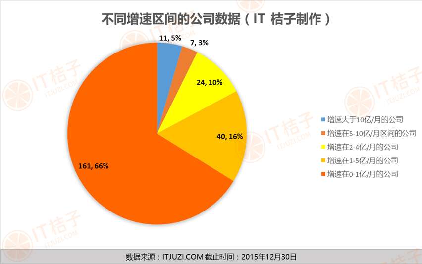在梳理IT桔子数据的时候,我们可以明显看到:公司之间的估值增速其实是非常不均衡的,有几家极高估值增速的公司明显拉高了整体的平均值,不然大家可能在想“平均每月估值增速2亿元,那岂非5个月就进入千里马呢?”事实当然并非如此,让我们根据估值增速区间的不同,来进行更具体的细分,从上图中可以看到: