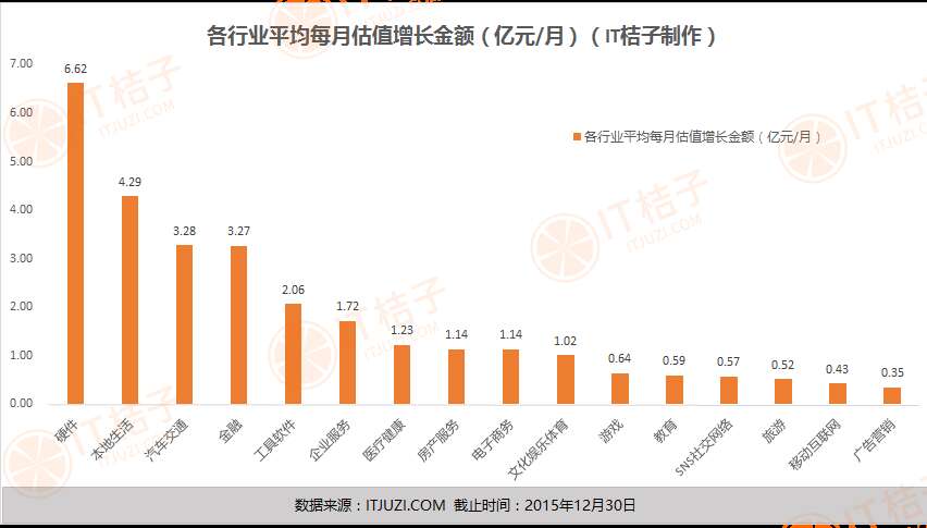 从IT桔子所统计的平均行业估值增速来看,硬件冲在第一位,达到了6.62亿/月,最重要的原因当然在于小米贡献了近一半的估值增速,去掉小米科技之后硬件行业估值增速只有3.23亿/月。