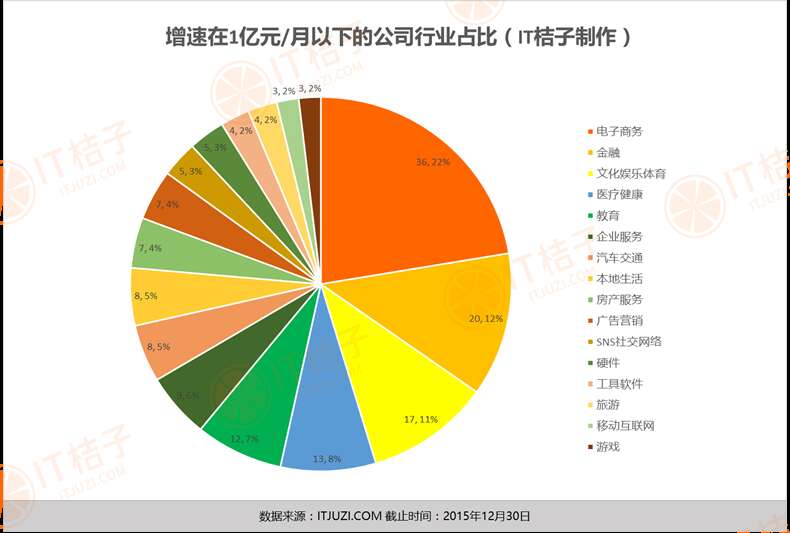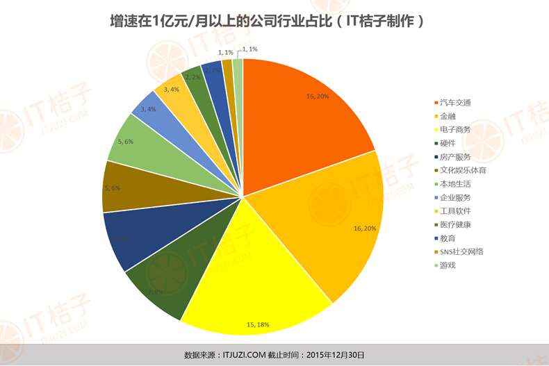 从上面IT桔子明显感觉到每个行业中的公司估值增速相差太大,毕竟66%的公司估值增速在1亿元/月以下,为此IT桔子以1亿元/月为分割线,看看估值增速的行业分布会有什么新变化?