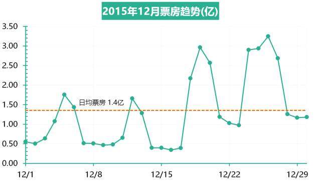 12月日平均票房1.4亿,单日最高票房出现在12月25日,完成票房3.25亿,排名2015单日票房榜第6位;当月累计有10天高于日平均票房水平。
