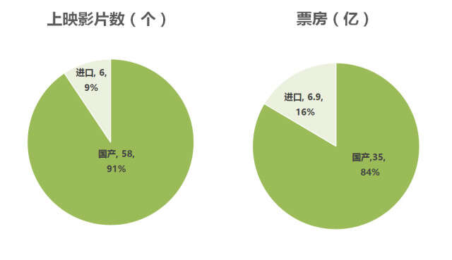 12月共上映新片64部,其中国产片58部,进口片6部。12月,国产片票房35亿,占比83.6%,进口片票房6.85亿,占比16.4%;本月国产片表现优秀,场均票房、场均人次均高于进口片。