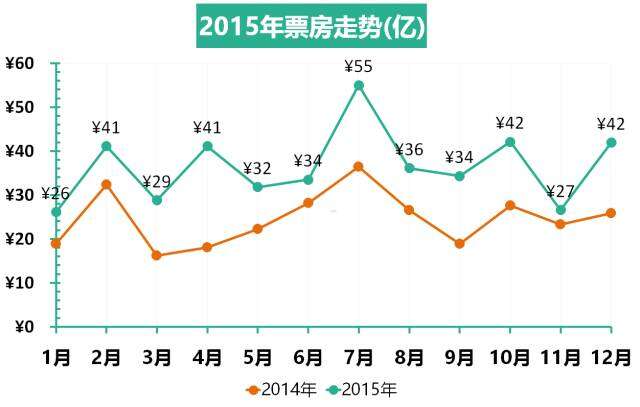 12月票房41.9亿,同比2014年12月增长62%;环比2015年11月上升58%;2015全国累计票房超440亿,比2014年总票房增长了近50%。