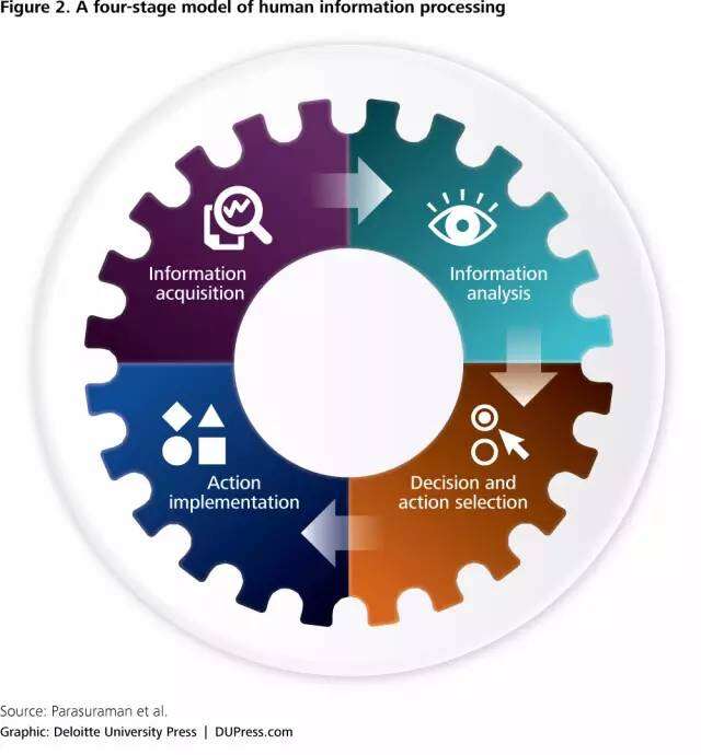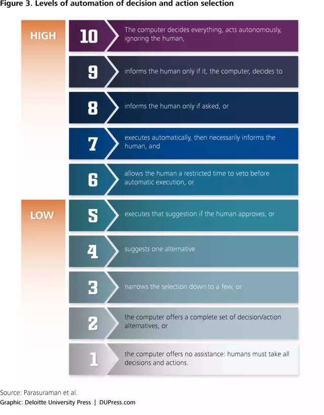 认识到关于自动化的潜在问题,研究人员们便尝试寻找一些确立系统有哪些功能,要实现什么程度自动化的客观方式。为解决这一问题,Parasuraman等人发展出一项分析自动化选项的体制。他们提出自动化须应用于以下四大类功能:1)信息获取;2)信息分析;3)决策和行动选择;4)行动实施(见图2)。在每一类中,自动化被应用的程度是一个从低到高的连续等级,即从完全人工化到完全自动化(见图3)。
