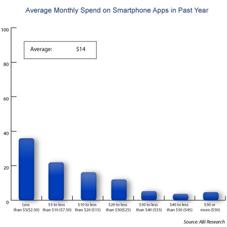 现在,并不是大多数的移动用户对于在应用上花钱并不感冒:有三分之二的应用用户称他们之前至少会为应用付过一次费用,平均的费用为每月14美元。不过,中度用户在移动方面支出数为每月7.5美元,远远低于平均值。由此可以看到,“大鱼”的支出就突显出来了。ABI称,这个数据显示,一小部分的“重度付费者”在整个市场收入中起到了“不成比例”的作用。