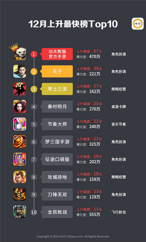 二、12月份百强手游曝光度Top 10与百强游戏类型分布
