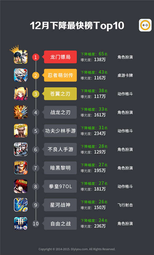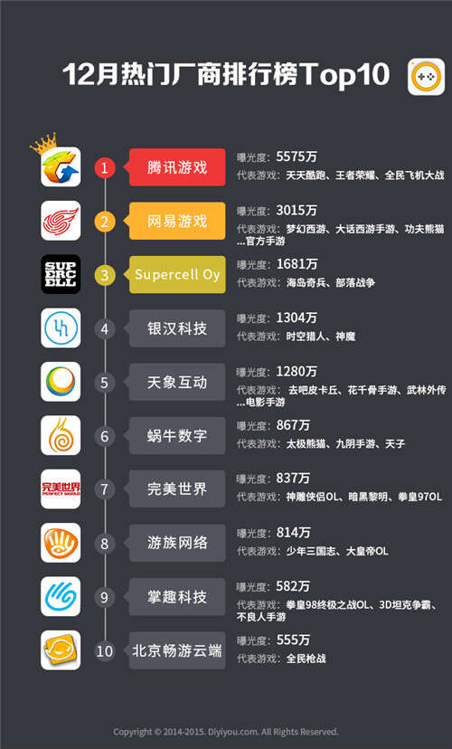第一手游网2015年12月中国手游曝光度报告,通过对国内主流手机应用市场的每日下载量TOP100游戏的曝光量进行监测,罗列了新游入榜、游戏厂商和游戏升降榜,对热门游戏、热门游戏厂商、商店分发和用户情况进行了分析。力求能还原国内手游市场的真实情况与发展趋势,希望能为市场各方提供参考意见与建议!